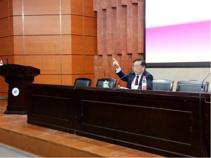 活动进入第二个环节,由曾担任过外交学院党委书记、常务副院长的袁南生教授做主题演讲“走进世界的中国外交智慧”。袁教授语言幽默风趣,表述清晰易懂。他以“五”为支点,给各位与会者详细讲解了我国外交在面对例如我国大使馆如何应对美国制裁津巴布韦、与穆加贝总统参加北京奥运会前后事宜、韩亚空难以及处理津巴布韦粮食援助等“五大考验”;促进中国与津巴布韦的佛教交流、号召在津华侨华人收养艾滋病孤儿、建立苏里南华人华侨社团联合总会、推动中国春节成为苏里南法定假日,以及妥善解决在苏里南非法入境的华人问题的“五大善事”;并以此提出要培养大国公民心态、敢于创新、勇于担当、灵活变通、注意细节“五点思考”。袁教授表达流畅有趣,其话语中彰显出的大国气量与大国智慧,令会场中时不时响起崇敬与骄傲的掌声,现场气氛极其热烈。为本次公共外交走进高校系列活动启动仪式画上了圆满的句号。