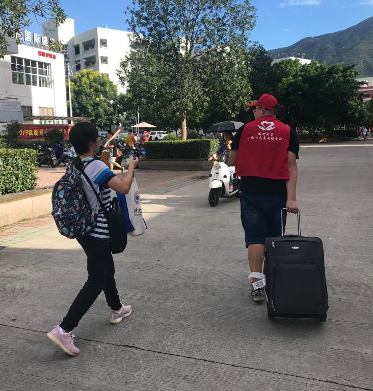 来来往往的车熙熙攘攘,大包小包里,充满的都是父母对子女的深情。今日,家长带着19级新生们踏上了大学的征途,托行李、办宽带,父母将一丝不苟的爱装进了新生们暖暖的被子里。长长的队伍,一眼望去,是迫不及待想要融入大学生活的眼睛。红色的衣衫在秋光的照耀下显得格外的鲜亮,志愿者们帮助新生搬运行李,为他们指引寝室的道路,给他们办理网上报到手续、发放校园一卡通以及入学的指引资料。志愿者们亲切的笑脸与问候,耐心的答疑与帮助,在秋天的微波里荡漾出了一圈圈温柔的涟漪,让新生们感受到了未来生活的地方有一个温暖的大家庭。