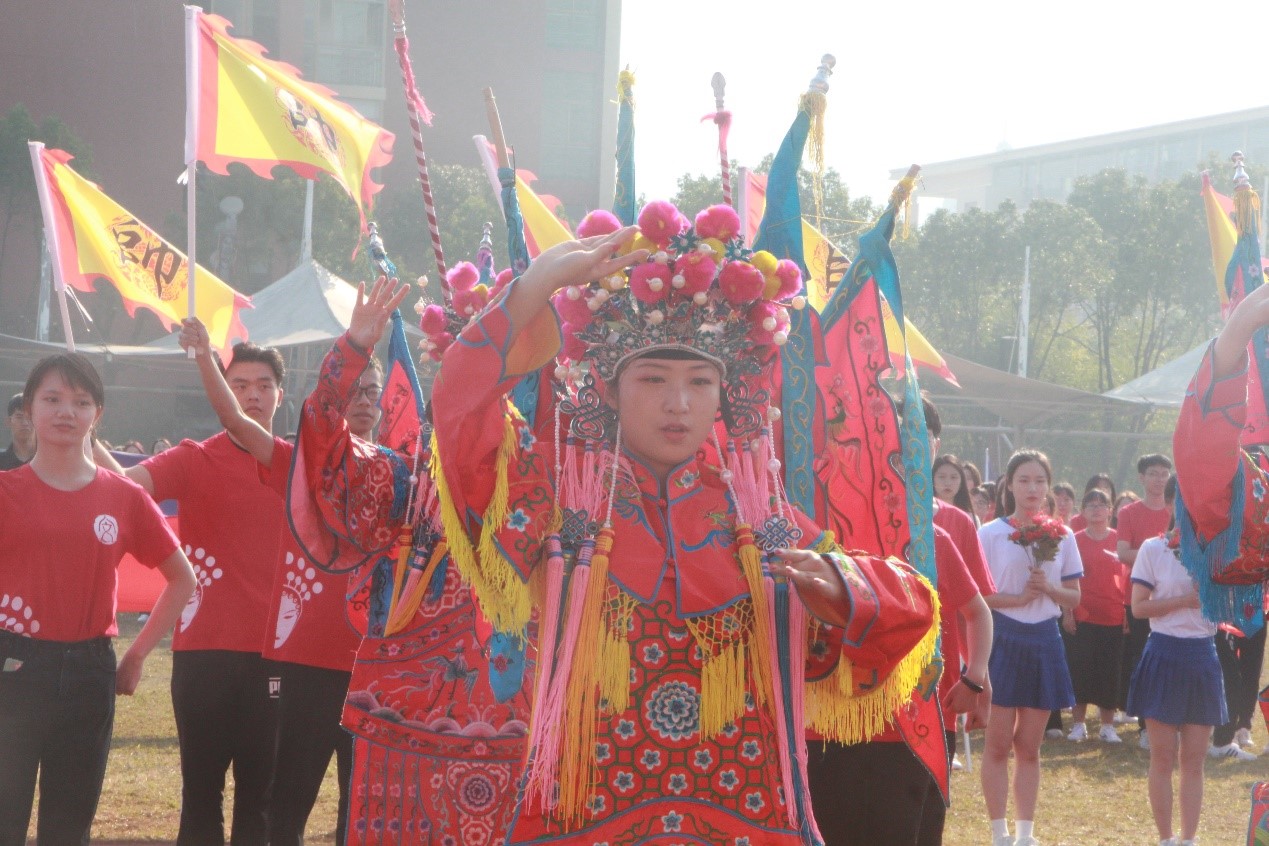 开幕式上,伴随着激昂雄劲的运动员进行曲,国旗、校旗、会旗三面旗帜缓缓入场。接着是各学院的方阵,他们迈着整齐有力的步伐依次经过主席台。吃瓜网 方阵用一段南戏表演《穆桂英挂帅》向本次运动会致敬,七个“穆桂英”身穿帅服,姿态与招式之间展现了穆桂英挂帅之后豪气万丈、气贯长虹的将帅风采。两侧的同学或手执长枪,或紧握旗帜,整齐有序,发出“嘿吼嘿吼”的口号声,更添磅礴气势。为了这短短的几分钟,方阵队员们在落日余晖中一遍又一遍地编排,在漆黑寒冷的晚风中一次又一次练习,汗水的付出得到了回报,这一精彩的表演赢得了阵阵掌声。