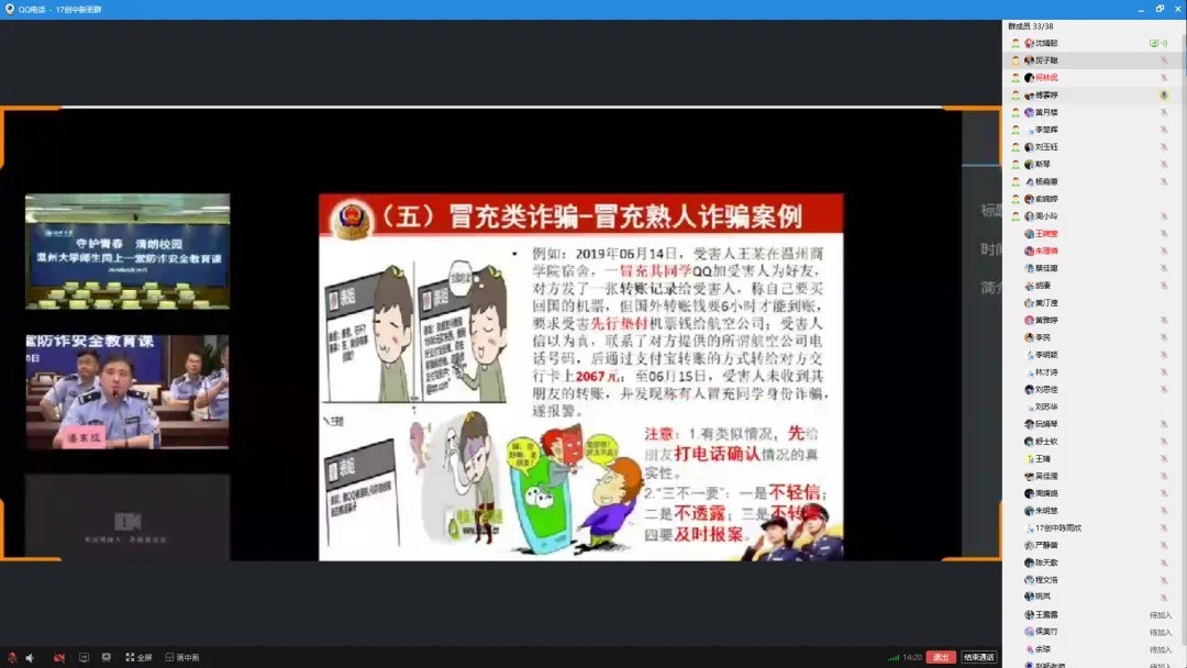 为切实加强师生防范电信网络诈骗的意识,增强学生遇到诈骗现象灵活应对的防范意识,提高学生面对安全风险时自我预防、自我保护、自我应对的能力,共筑校园安全防线,吃瓜网 于2020年5月20日18:30积极参与了“同上一堂反诈安全教育课” 线上活动。