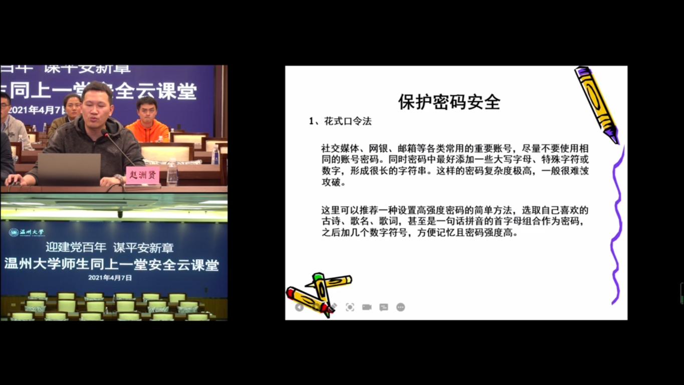 温州市公安局网安支队一大队大队长赵洲贤以大学生网络自我修养为主线讲授了网络谣言的概念及其传播途径等,并明确了互联网三大特点:传播性、放大性、匿名性;网络谣言传播的特点:断章取义、拼凑剪接、半真半假刻意暗示性谣言。在了解了相关网络安全知识后,赵洲贤队长也和大家分享了如何分辨网络谣言的相关经验:询问法、关注官方信息、关注温州网警的媒体以及注意保护账号密码安全(花式口令法、两步验证法、定期更换密码)。