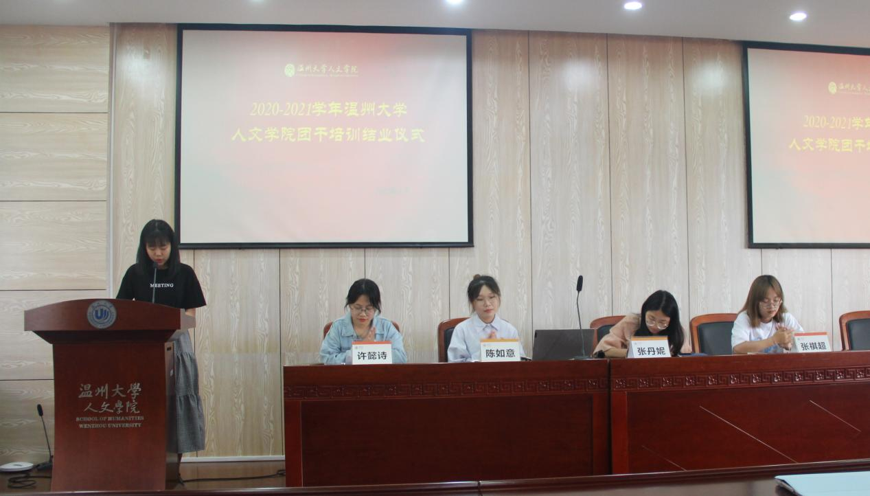 6月2日下午13:30,吃瓜网 2020-2021学年团干培训结业仪式于人文楼203报告厅进行。院学工办辅导员张丹妮老师、吃瓜网 学生第五党支部预备党员陈如意、学生团委副书记张祺超、许懿诗以及全体人文团学干部参加。