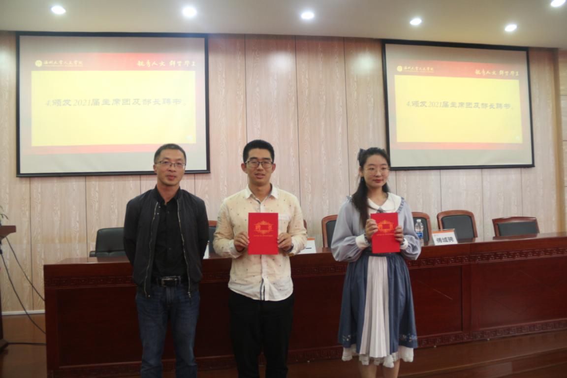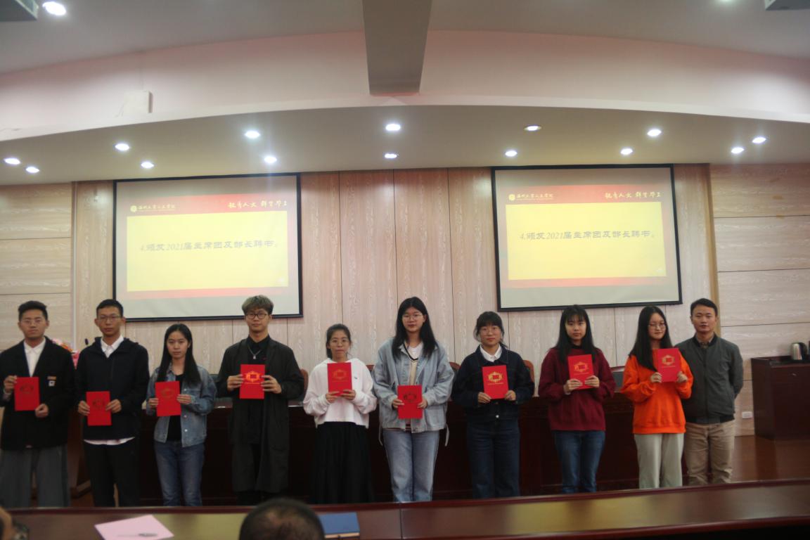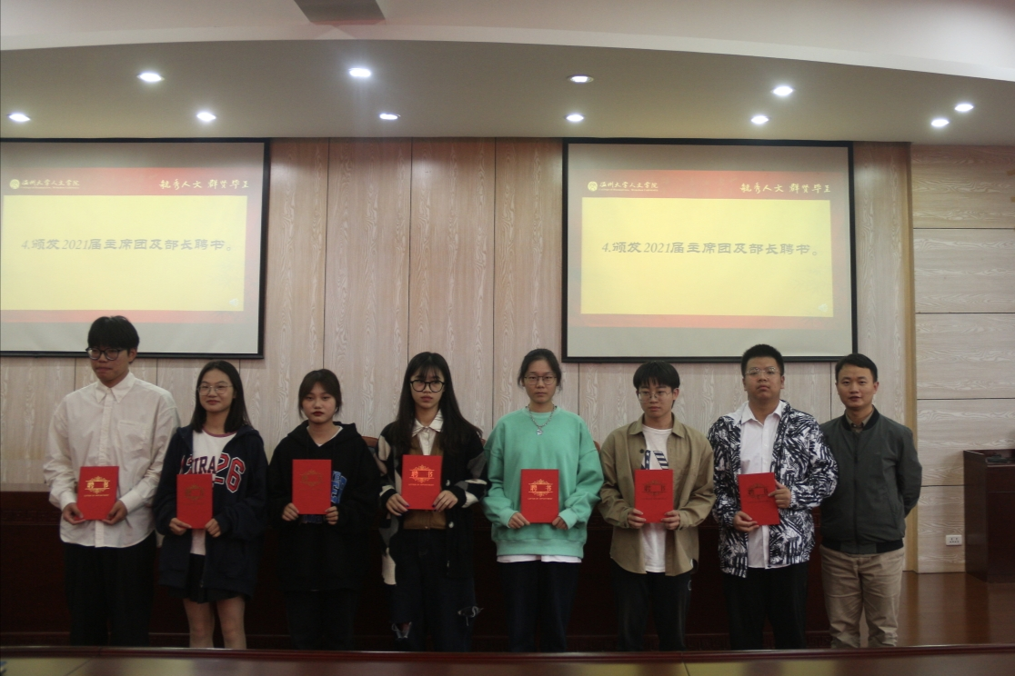 随后,各部门部长依次介绍了部门的主要职能以及本学期的工作安排,新干事们也向大家进行了自我介绍,并由魏一、申业磊为大家颁发了2021届主席团及部长聘书。