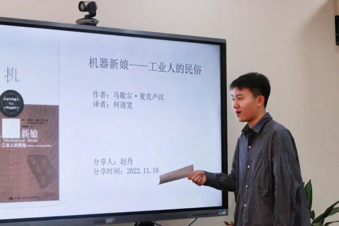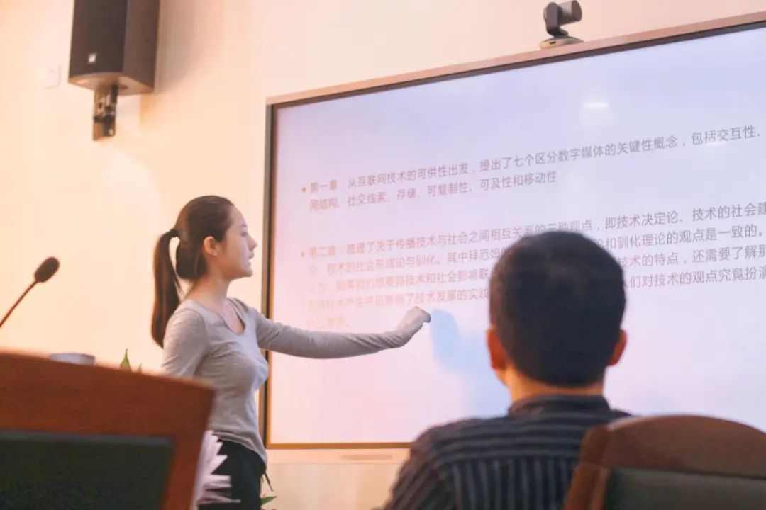会上,赵丹、王钟磊、蔡凌睿、黄昕、陈亚琴五位同学依次向老师和同学们分享了《机器新娘——工业人的民俗》、《交往在云端:数字时代的人际关系》、《乡土中国》、《新闻业的救赎》、《美丽新世界》等书籍。