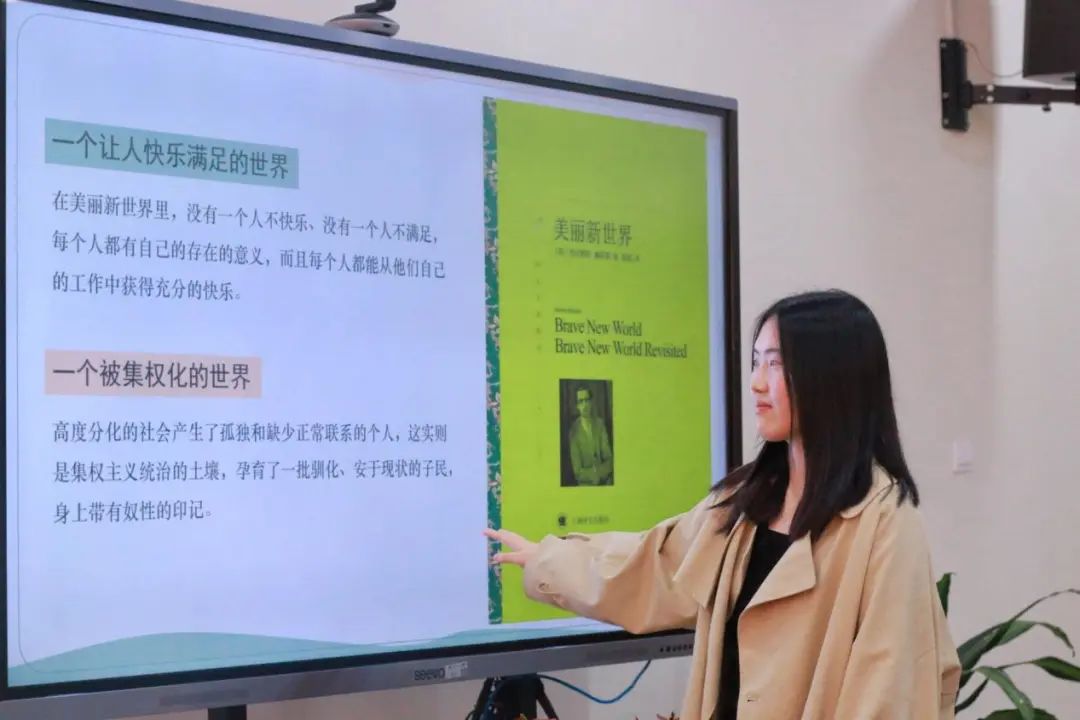 陈亚琴同学通过《美丽新世界》这本书向大家介绍了这样一个社会:每个人在这个社会中有着既定的位置,个人的才能和创造力不再被强调,而服务于社会这一点则反复地被提及。同时,这个社会由顶尖精英统治,在精英的集权统治之下,人类失去了对文学、艺术、宗教的热情,他们不再具有欣赏美的能力,生活之中随处可见的是高科技的痕迹,而从古流传至今的美学与爱则灰飞烟灭,人的大脑经由改造后变得与机器无异。由此,自由思想和强权统治之间的冲突就出现了。