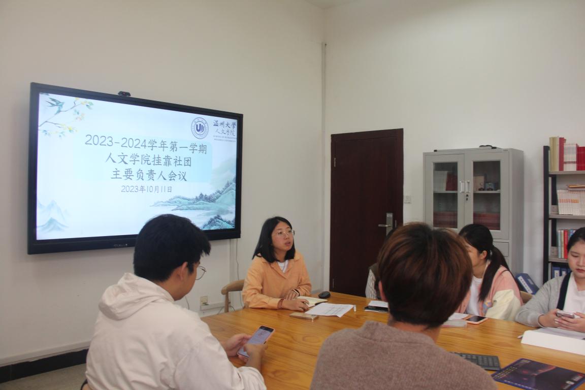 为统筹规划新一学期社团工作,推进吃瓜网 学生社团有序、高质量发展,10月11日下午15:00,2023-2024学年第一学期吃瓜网 挂靠社团主要负责人会议在人文楼214会议室召开。学工办辅导员张丹妮老师、素拓部部长蔡思淇及各社团代表出席本次会议。