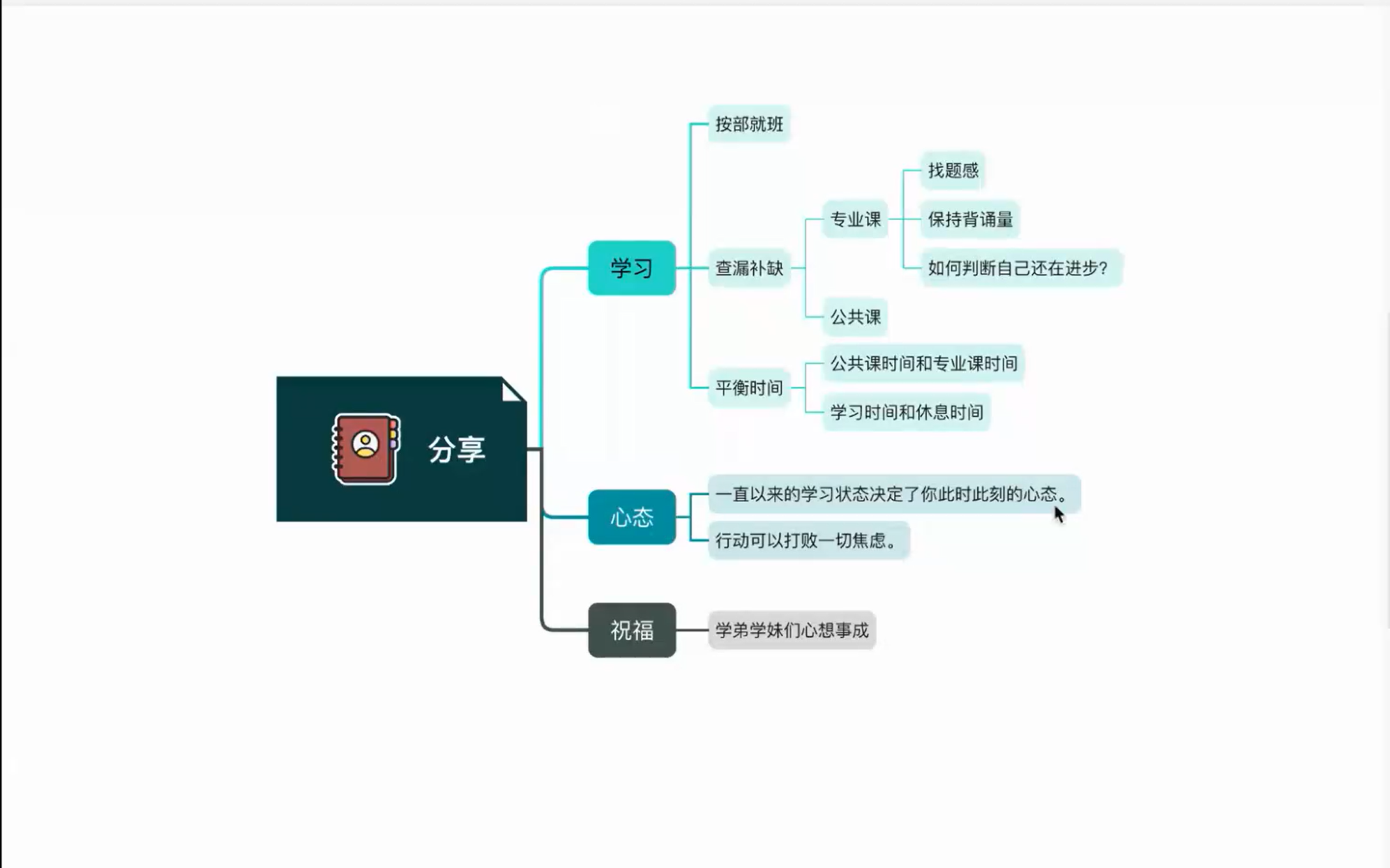 19创意中文吴若琰学姐以思维导图的方式,建议学弟学妹们在学习上,要注意按部就班、查漏补缺、平衡时间;在心态上,牢记行动可以打败一切焦虑;在背诵上,强调要理解文本,不要死记硬背,提高自己的思考能力。