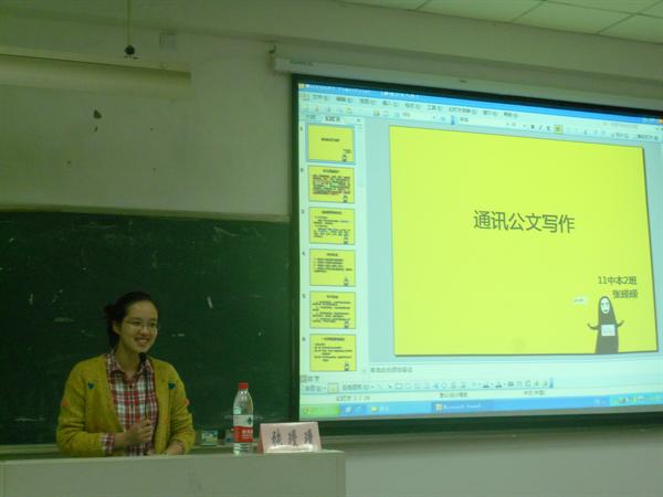 张瑾瑾副主编对如何写好通讯展开了系统的讲解。首先,她讲解了通讯的定义和特点,让同学们对于通讯有了新的认识。然后,张主编又从标题、正文、首段、主体与结尾这五个方面进行了详细地讲解,让同学们更加明确了通讯的主要组成部分的精髓,为同学们写好通讯打下了基础。另外,她又向同学们介绍了几个十分重要的注意事项,这对于初次接触通讯的同学们很有指导作用。最后,主编用“一分钟教你写通讯”的方法精炼简洁地概括了写好通讯的几个要素。为了更好地让同学们分辨通讯的优劣,主编同时列举了几篇或好或差的通讯,请同学们对其进行了点评,从中发现其优缺点,以此加深同学们的印象。