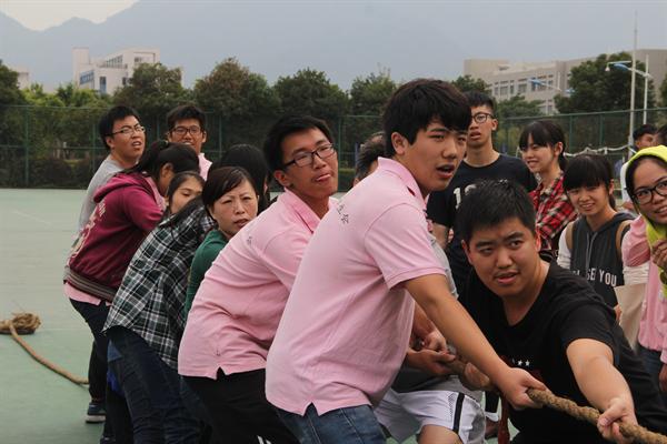 紧接田径项目而来的趣味团体赛是本届院运会的最大亮点。定点投篮、两人三足、集体跳绳、心心相印、拔河等趣味横生的运动项目可谓将班级团结精神体现得淋漓尽致,同学们的凝聚力在一片欢声笑语中得到了加强,赛场气氛也逐步升温。