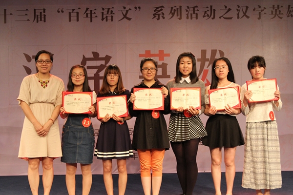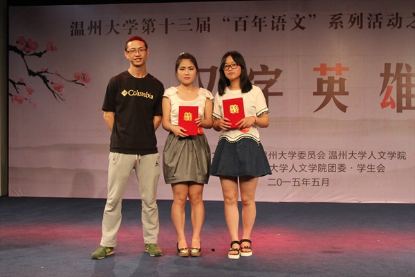 陈萍萍同学、外国语学院陈娜娜同学分别斩获“汉字榜眼”、“汉字探花”称号。接下来,按照赛程安排,“汉字状元”董天圆同学要与去年汉字英雄冠军-来自瓯江学院的何凡同学展开一场终极对决。这轮PK的试题以字谜与成语猜谜为主,难度大大增加。两大高手互不相让,激烈比拼,使全场气氛达到了最高潮。最终,何凡同学守擂成功,荣膺“汉字英雄”称号。整场比赛在热烈掌声中圆满落幕。