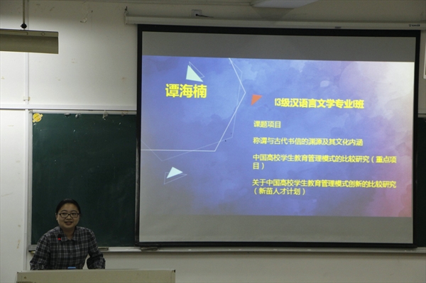 最后的经验分享环节中,首先进行分享的是张露学姐。张露学姐的分享条理明晰,内容充实。她提出的从生活和学习两个方面寻找课题,从央视的文化纪录片中搜寻资料,请适合自己课题的老师进行指导等都对科研立项有非常实际的指导意义。第二位进行分享的是陈洁学姐,陈洁学姐从自身的专业出发,重点阐述了历史专业进行课题确定的优势以及团队协作的重要性,提出了立项是骨架,结题就是要不断填充这一切实观点。第三位进行分享的是谭海楠学姐,谭海楠学姐没有直接讲述科研立项的经验,而是从她做新苗计划时的经历入手,突出了创新和实地考察的重要性。她平实幽默的语言,使得现场气氛更为轻松欢快。
