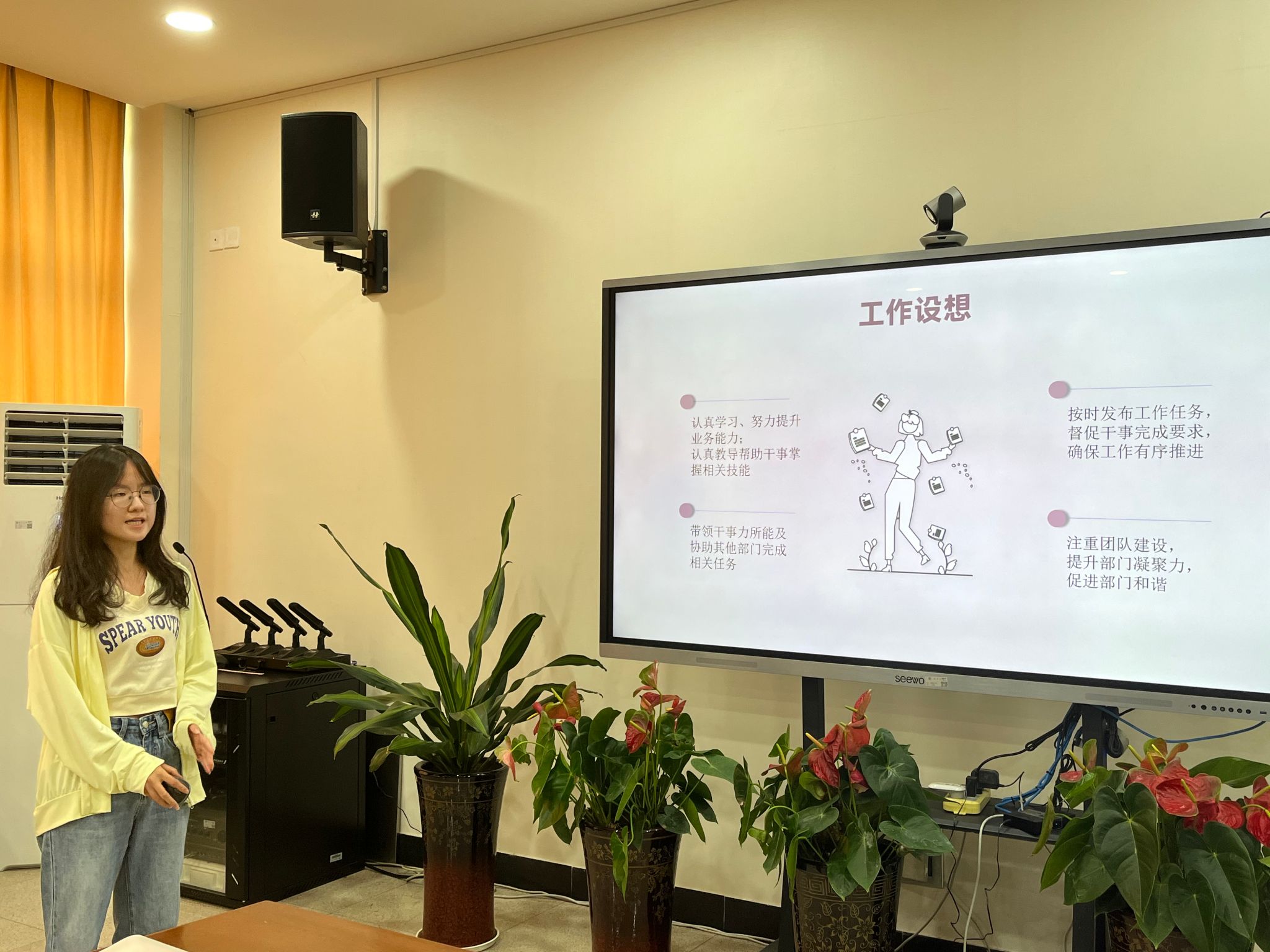 在换届竞选过程中,各部门竞选者通过PPT演讲的方式展示自己的学生工作经验和竞选优势,也对未来的工作进行了展望。学院校友工作服务中心现任主任及部长就部门情况、组织建设等方面向竞选者提问,竞选者的应答展示出较强的应变能力及对部门建设的各类思考。