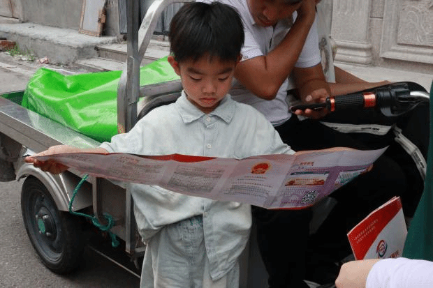 蝉鸣悠扬,似在为这场文化盛宴伴奏。队员们偶遇一家四口,在三轮车旁悠然小憩,迎着他们好奇的目光。队员们上前,轻轻将宣传册递到年纪最小的小男孩手中,小男孩的眼睛瞬间亮了起来,迫不及待地翻开册子,他的眼睛瞪得圆圆的,紧紧盯着封面上的每一个细节,小手轻轻摩挲过册子上那些描绘着乡村美景的照片,脸上洋溢着专注与向往的神情。