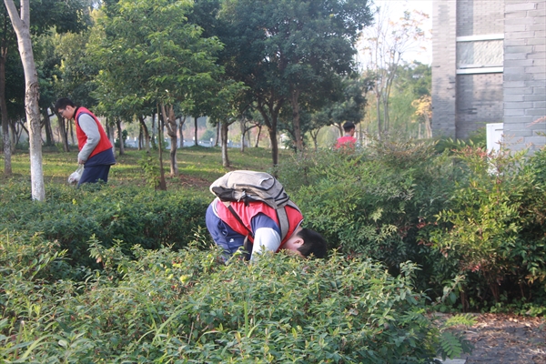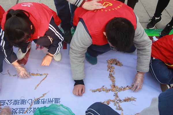 招募人员,同学们便踊跃报名。 志愿者们集合完毕后,便前往活动地点。1:30到达活动地点白鹿洲公园。在所有志愿者们到达场地后,活动负责人为各志愿者拍摄合影后,分发了垃圾袋与一次性手套,志愿者们便开始了环保捡烟蒂的活动。志愿者们分成三路向不同的方向出发,公园里的行人来来往往,欣赏美景。志愿者们正在低头寻找捡拾起被遗落在莫个不起眼角落的烟头和垃圾。志愿者们在捡拾垃圾的同时,受到了公园里人们的称赞,甚至有人要求合影。志愿者们穿梭于公园的每个地点,湖边,树下,草坪上。甚至有些志愿者在公园里的建筑的角角落落都没有放过,手套也被树皮,野草割破,还是依旧没有停下捡拾的动作,很快在志愿者手中的垃圾袋已经满满当当。在道路一旁的城市清洁工阿姨们也十分感激,将自己的大垃圾袋送给志愿者使用。4点30的时候,经过两个半小时的努力,志愿者们都满载着烟头而归,在背景条幅上用烟头摆成“携手公益”的字样,4点10分最后志愿者们在自己摆好的字样后合影,并收拾好了活动物品离开了公园。