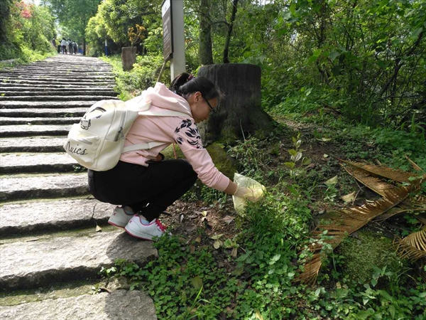 上午十点钟,同学们在大罗山脚下五美景园集合完毕,负责人宣讲了登山安全常识以及注意事项,并向大家分发了卫生手套。之后,同学自愿结合,以小组为单位进行登山。时值春末夏初,恰逢良辰美景,草丛中的废弃物显得格外扎眼,同学们在从山脚登至山顶的沿途中,弯腰捡起塑料瓶、包装纸等物品并丢到最近的垃圾箱中。在攀登的过程中,同学们也纷纷拿出手机,记录下这一时刻的绿意盎然。