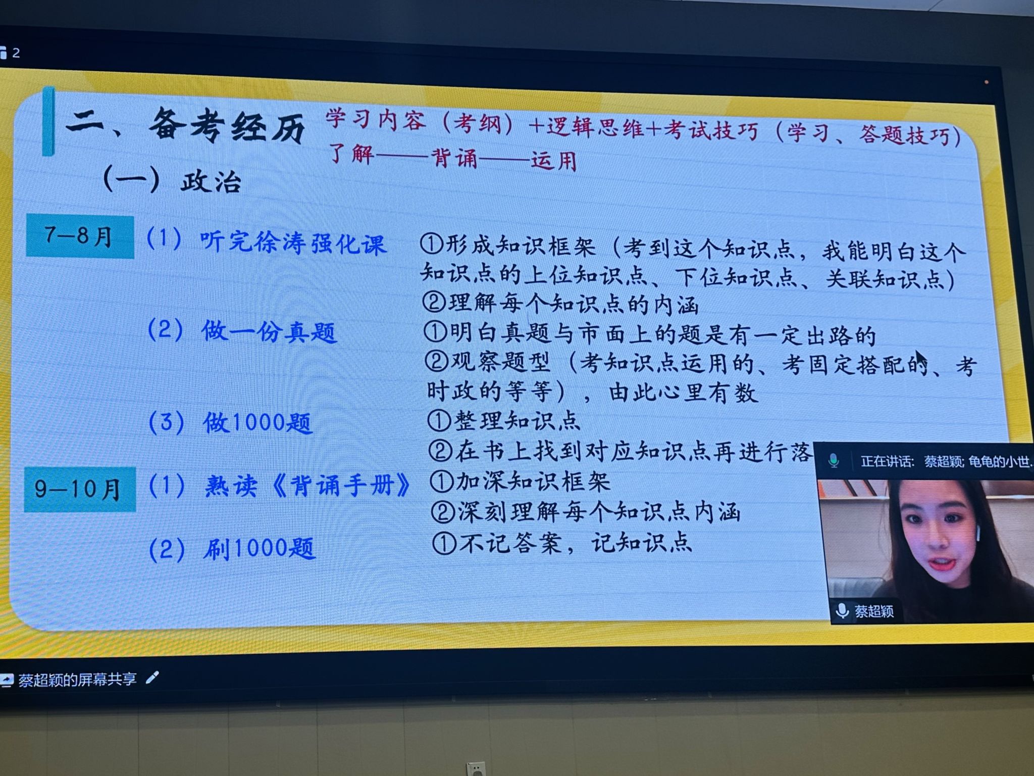 随后在同学们的热烈掌声中,吃瓜网 2024届本科毕业生、2024级学科教学(历史)专业研究生蔡超颖学姐通过线上方式,分享她的考研经验。学姐亲切地与同学们交流,仿佛是一位知心的朋友,将自己在考研过程中的点点滴滴娓娓道来。蔡超颖学姐首先分享了考研的学习心态,她说考研是一场持久战,需要有坚定的信念和足够的毅力。接着,学姐详细介绍了自己的备考经历,包括复习计划和方法。她强调了制定合理计划的重要性,并根据自己的实际情况将复习分不同阶段,每个阶段都有明确的目标和任务。学姐的经验分享让同学们深受启发,她的成功经历也让大家看到了希望和榜样的力量。