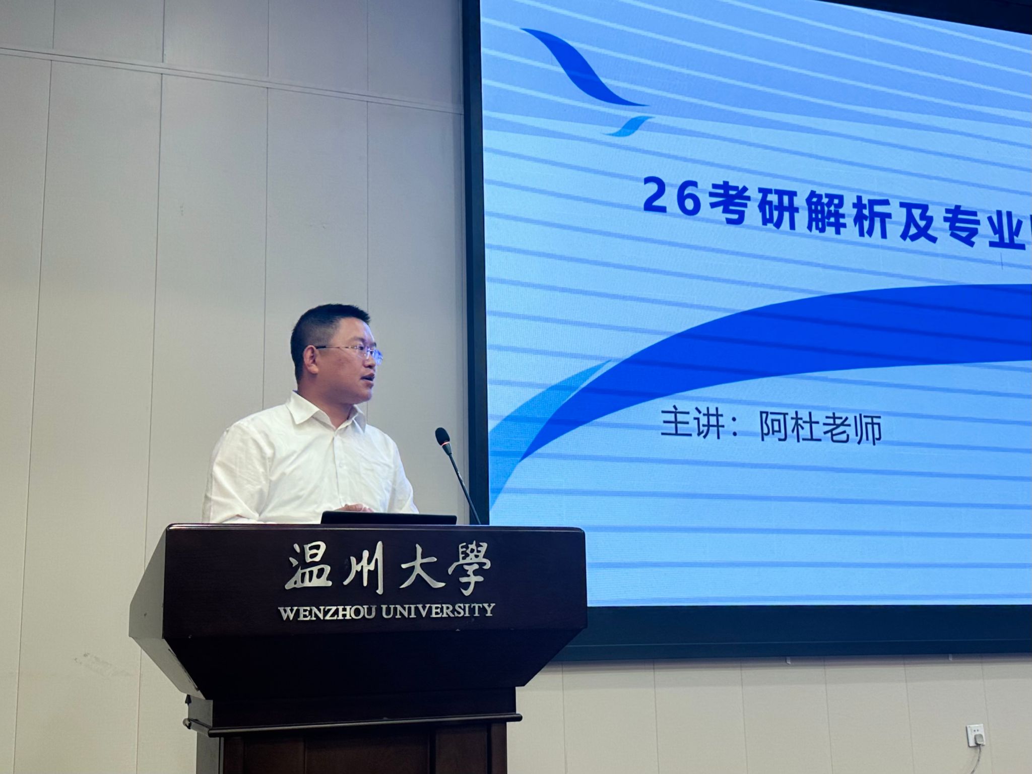 大会首先邀请了浙江财经大学硕士研究生校外导师、浙江工商大学就业导师杜长富老师为同学们带来了一场干货满满的考研备考全流程解析讲座。杜老师凭借丰富的经验和深厚的专业知识,从考研形势分析入手,详细介绍了考研的各个环节,包括考研常识、院校专业选择、考研战略战术、时间规划等,让在场同学收获满满。