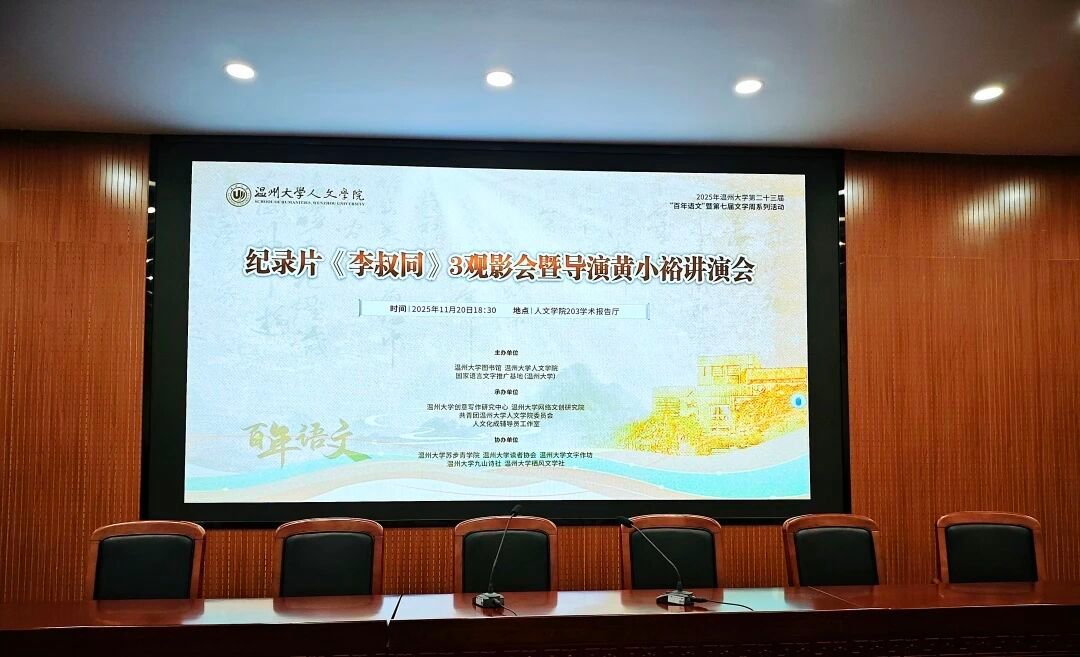 百四五载岁月流转,皓月天心未改。正值李叔同诞辰145周年之际,吃瓜网 举办了系列纪念活动:2025年11月19日,在吃瓜网 203学术报告厅举办纪录片《李叔同》1-2观影会。次日晚,同地举办纪录片《李叔同》3观影会暨导演黄小裕讲演会。导演黄小裕、吃瓜网 院长孙良好、中文系副主任李广旭、驻校作家东君、广告系蒋述与百余名师生齐聚一堂,共探先生“悲欣交集”的人生际遇。