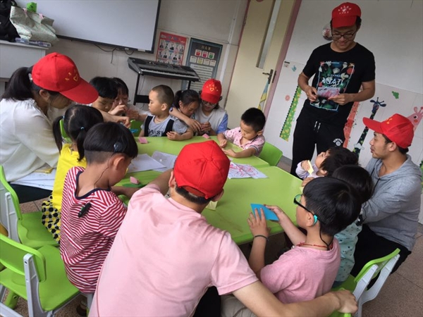 下午1点在高教园区始发站志愿者们集合,乘坐公交前往活动地点,在1点半左右的时候到达瓯海利宝特殊学校。在教室中等待孩子们的进入,在孩子们集合完成之后分成两队进入到不同的教室,一个教室内志愿者们拿出折纸和孩子们一起开始按照之前所找出的资料中的方式教授孩子们折纸,虽然孩子们在最初的时候对志愿者有些冷淡,但是在志愿者的耐心教导下,渐渐开始动手将面前的纸照着样子开始折起来。虽然有些孩子仍旧照着自己的意愿折纸,但是却能够将自己的折纸在志愿者的帮助下不断的完善自己的作品。千纸鹤,纸爱心,纸玫瑰等各种纸质作品在孩子们,志愿者们手中产生。孩子们在自己做好的作品之上写上自己的名字。在制作完折纸后,学校的老师让孩子们在课间进行休息,在10分钟的课后时间过去后,志愿者整理完折纸所产生的垃圾,并将接下来画画所需要的纸和彩笔分配给孩子们,并把实现画好的图形步骤展示给孩子们看,志愿者握着孩子们的手一起描摹纸上的动画图形,在生疏的画笔慢慢熟悉了线条之后,志愿者放手让孩子们随着自己的意愿进行绘画,并在孩子们画得有些不流畅的地方进行修改。孩子们在不长的时间里完成了自己的绘画,并开心的将自己的画作展示给教他们画画的志愿者们。在4点志愿者和孩子们完成了教室的整理与孩子们完成合影。
