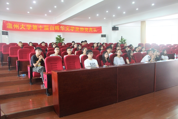 首先,一段历届获奖者留言视频唤起了大家对白晖华发展历程的感动与感叹。然后,朱书记简要介绍了白晖华文学奖的相关情况和十年来走过的历程。白晖华文学奖由温州籍文学爱好者吴明华先生出资设立,旨在鼓励热爱写作的大学生坚持文学梦想。十年间,白晖华文学奖在许多我校大学生的写作经历中,留下了韫玉含辉的一笔,托起了学子们的写作梦。接下来,获奖者们上台领奖并合影留念,鲜红的奖状是对同学们写作最好的鼓舞。之后,一等奖获得者13中本储展鹏代表获奖同学上台发言。他谈到,我们在人生中应读三本书,首先是有字之书,即阅读量的积累;其次是无字之书,要用于去远方,去认识更多的人,找到属于自己的路;还有心灵之书,要找到自己的信仰,坚持一路激情、矢志不渝。朱闻武先生也进行了饱含感慨的发言。他说,白晖华文学奖发掘了有才华的年轻人们,这个奖项也是同学们青春中很有成就感的事情。奖项发起人吴明华先生是优秀的作家和经商者,白晖华也是其对文学教育事业的关注与热爱最好的见证。这十年来,岁月轮转,文学奖能延续下来十分可贵。这得益于吴先生对其的呵护与珍惜,也离不开温大校方的重视与培育。文学的梦想是本无字之书,是一切艺术的母体,愿文学事业发展源远流长。