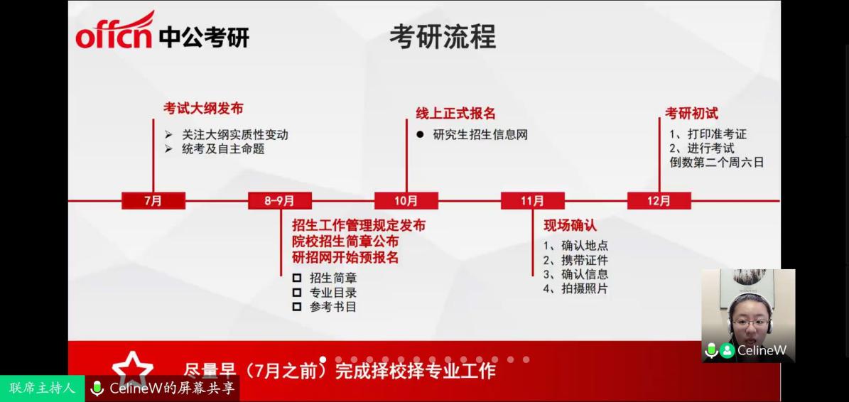 王讲师主要由以下三个部分展开:首先,她对目前考研形势进行分析,回顾往年硕士研究生报考人数,分析目前考研基本持逐年增长的态势;考生读研首要动机依然是要提高就业竞争力,她预测报考人数会持续高速增长。其次,讲师对目前就业方向前景进行揭秘,对文学类专业的工作岗位一一分析并且建议同学们尽量早完成择校择专业工作,事先了解高校专业培养目标、就业方向、招生情况后,再去选择适合自己的专业,而不是盲目追求热门专业。最后,王讲师热情邀请同学们加入中公教育的备考直通车,帮助考生们实时答疑、制定计划监督,以便备考的同学们更好地踏上考研之路。