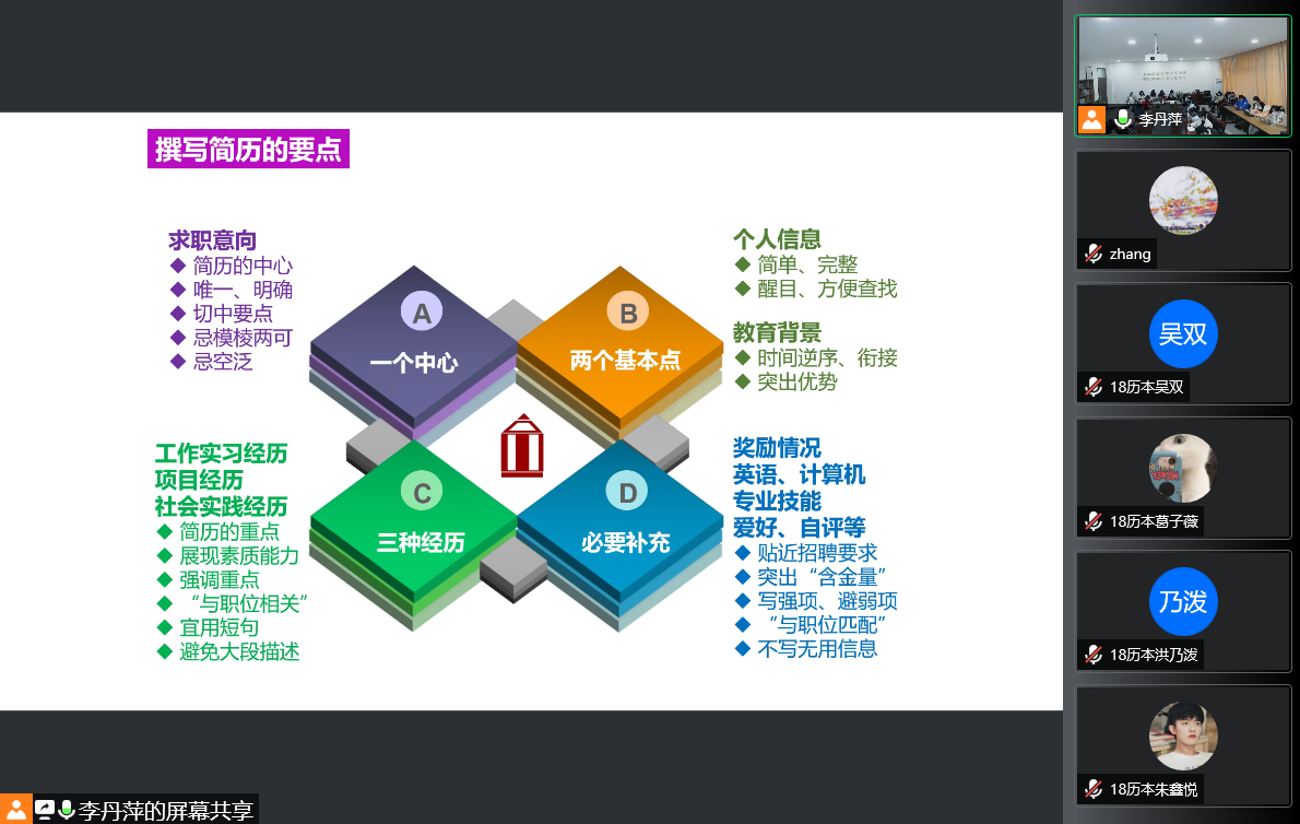 就业是最大的民生,也是关系全体毕业生切身利益的大事。为了给毕业生提供更好的就业服务,提升就业能力,助力毕业生更快、更好就业,2021年12月28日下午,吃瓜网 2022届毕业生就业动员大会暨简历与面试指导专题讲座通过线上与线下相结合的方式举行,邀请了校招生与就业处朱秀微讲解就业政策以及简历面试技巧。