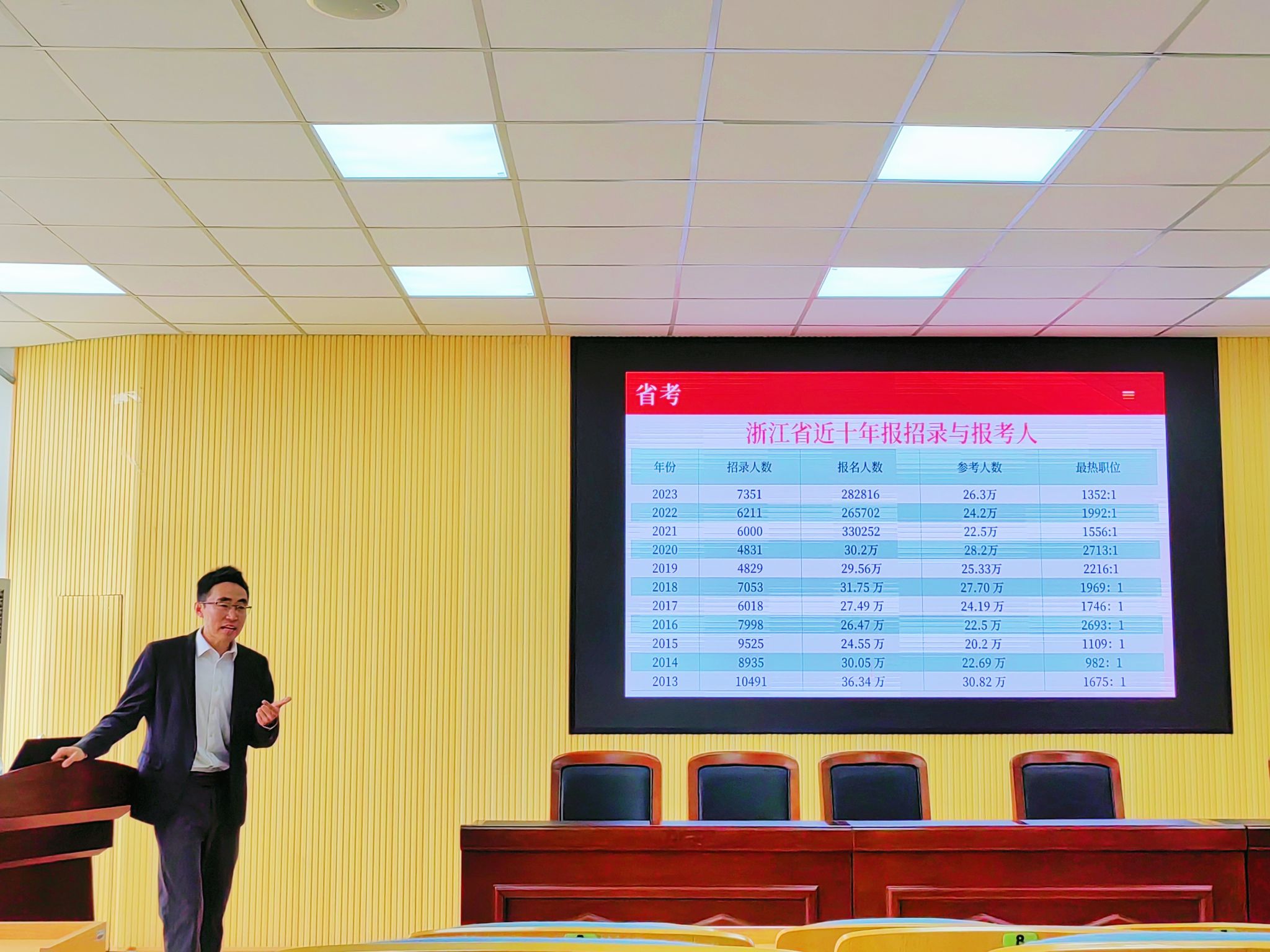 当天下午,祝老师以一道考公真题作引,展开此次“高质量就业大智慧”主题讲座。祝老师通过详细的表格向我们展示了大学生高质量就业的不同就业选择,包括高考、省考、选调生、教师编制、事业单位统招、军队文职等,并且列出不同就业选择的优缺点、适合专业、考试形式等,使同学们对不同选择有了更深刻的认识,更有利于同学们瞄准自己的备考目标。其中,祝老师还特别对国考与省考的区别、选调生的要求和近年省属重点建设高校县乡机关选调生录取情况、上海市考、2023年浙江省公务员录用考试专业参考目录等进行讲解,使同学们对自己的备考策略有更明确的规划。