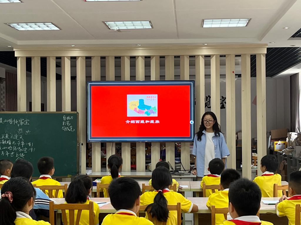 为丰富课堂内容,打造趣味课堂,实践队中的藏族同学旦增德琼语言生动、图文并茂,为小朋友们带来了一节充满藏式风情的课堂。首先,德琼同学对西藏展开简要介绍,展示了当地的美丽风景及风土人情,随后教授富有西藏民族特色的歌曲《卓玛》,带同学们领略藏歌的独特风格,感受藏族的独特文化。