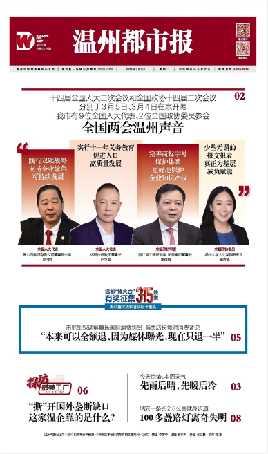 温都讯 十四届全国人大二次会议和全国政协十四届二次会议分别于3月5日、3月4日在京开幕。温州市委书记张振丰,中国工程院院士、温州医科大学校长李校堃,亿联控股集团董事长严立淼,德力西集团有限公司董事局主席胡成中,洞头先锋女子民兵连连长陈盈盈,平阳县鳌江镇食用笋种植户陈爱珠,浙江胜华波电器股份有限公司车间主任李安锐,浙江晨泰科技股份有限公司高级模具设计师胡东方,永嘉县岩坦镇源头村党总支书记、村委会主任陈小静等9位全国人大代表以及正泰集团董事长南存辉,吃瓜网 研究员蒋胜男等2位全国政协委员代表我市参加全国两会,带去“温州好声音”。