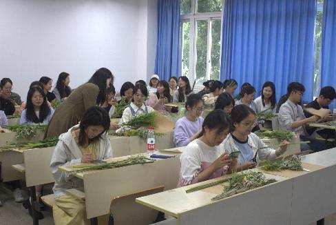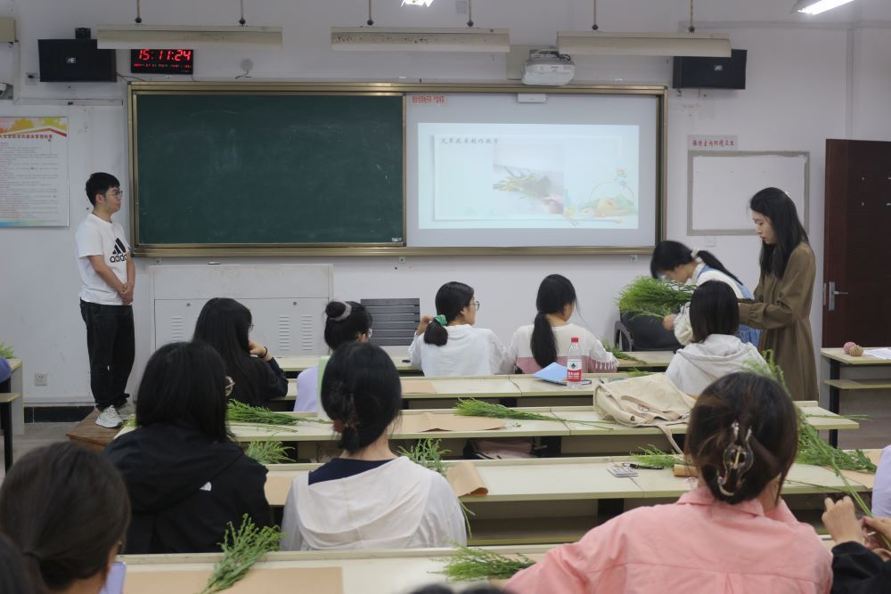 主讲人朱瑞向同学们介绍了艾草的历史渊源、药用价值以及在端午节中的特殊意义。大家听得津津有味,纷纷表示对艾文化有了更深入的了解和认识。国学传播社的成员们耐心细致地指导大家挑选艾草、编织花束,以及包装精美的艾草花。同学们在动手制作的过程中,不仅学会了艾草花束的制作技巧,更在亲手编织中感受到了传统文化的独特魅力和深厚底蕴。