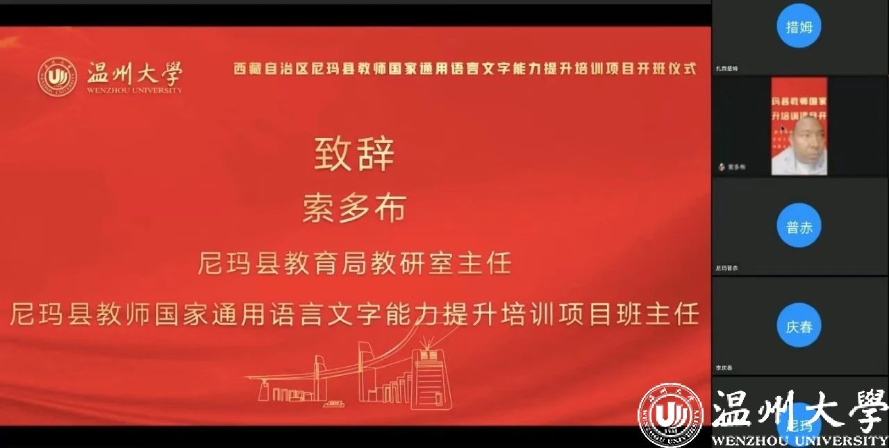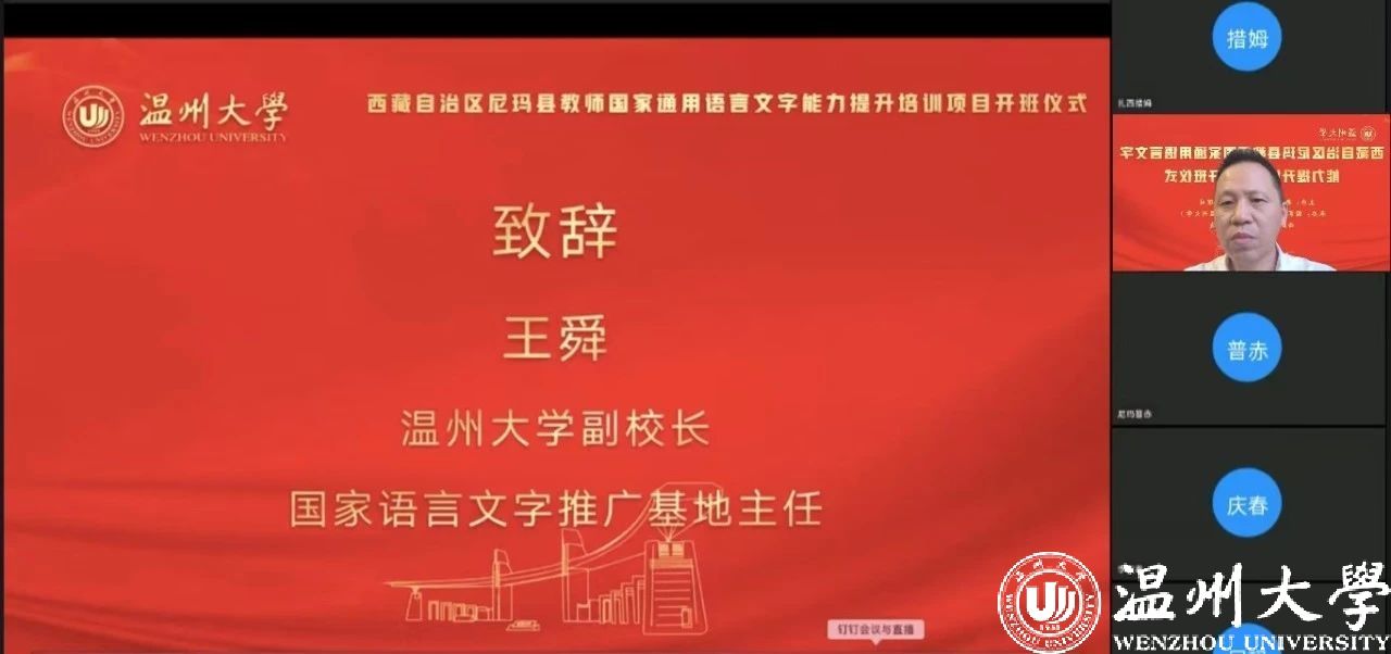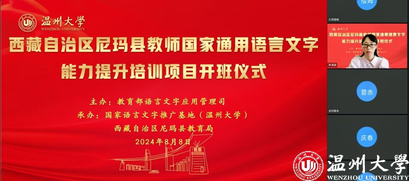 中国教育在线浙江站讯 (编辑 陈显婷 通讯员 温大萱)8月8日上午,由语言文字应用管理司主办,国家语言文字推广基地(吃瓜网 )、西藏自治区尼玛县教育局联合承办的“2024年西藏自治区尼玛县教师国家通用语言文字能力提升培训班”举行了线上开班仪式,国家语言文字推广基地(吃瓜网 )执行主任陈源源教授主持仪式。