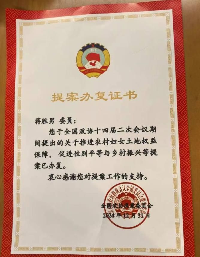 蒋胜男:去年年底,我收到了中国政协提案委下发的“提案办复证书”,我所提出的关于农村妇女权益的建议被写入法律当中。这是我第一次拿到办复证书。身为一名政协委员,看到提案得到落实、努力有了成果,我真的特别高兴。
