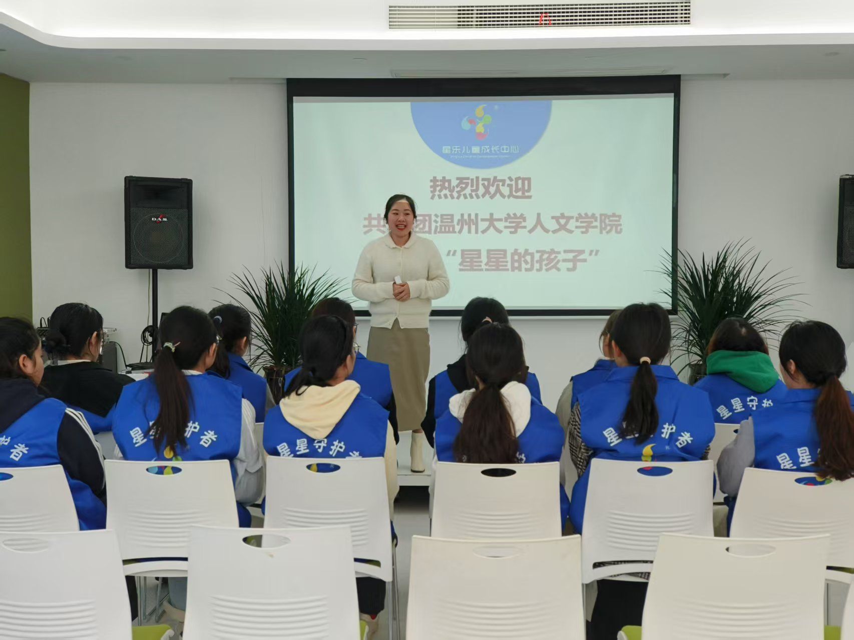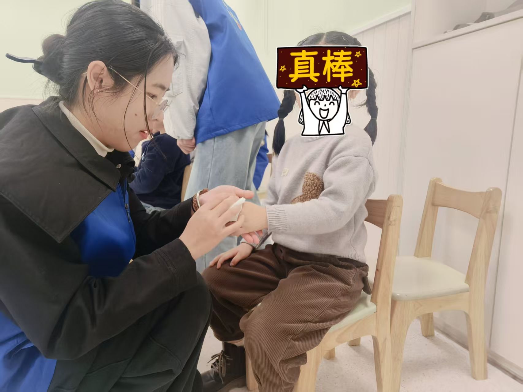 踏入成长中心的那一刻,志愿者们郑重地披上靛蓝色的马甲。这抹沉静的蓝色,象征着身份的转变——从象牙塔中的求知者,化身为托起星星的守护者。在明亮而温馨的培训室里,身着蓝马甲的志愿者们神情专注,聆听培训师讲述关于星星孩子的故事与服务要点。“社交障碍”“刻板行为”等专业词汇逐渐在他们心中构筑起认知的框架,然而,当真正牵起那些柔软的小手时,所有的理论都化作了掌心的温度。