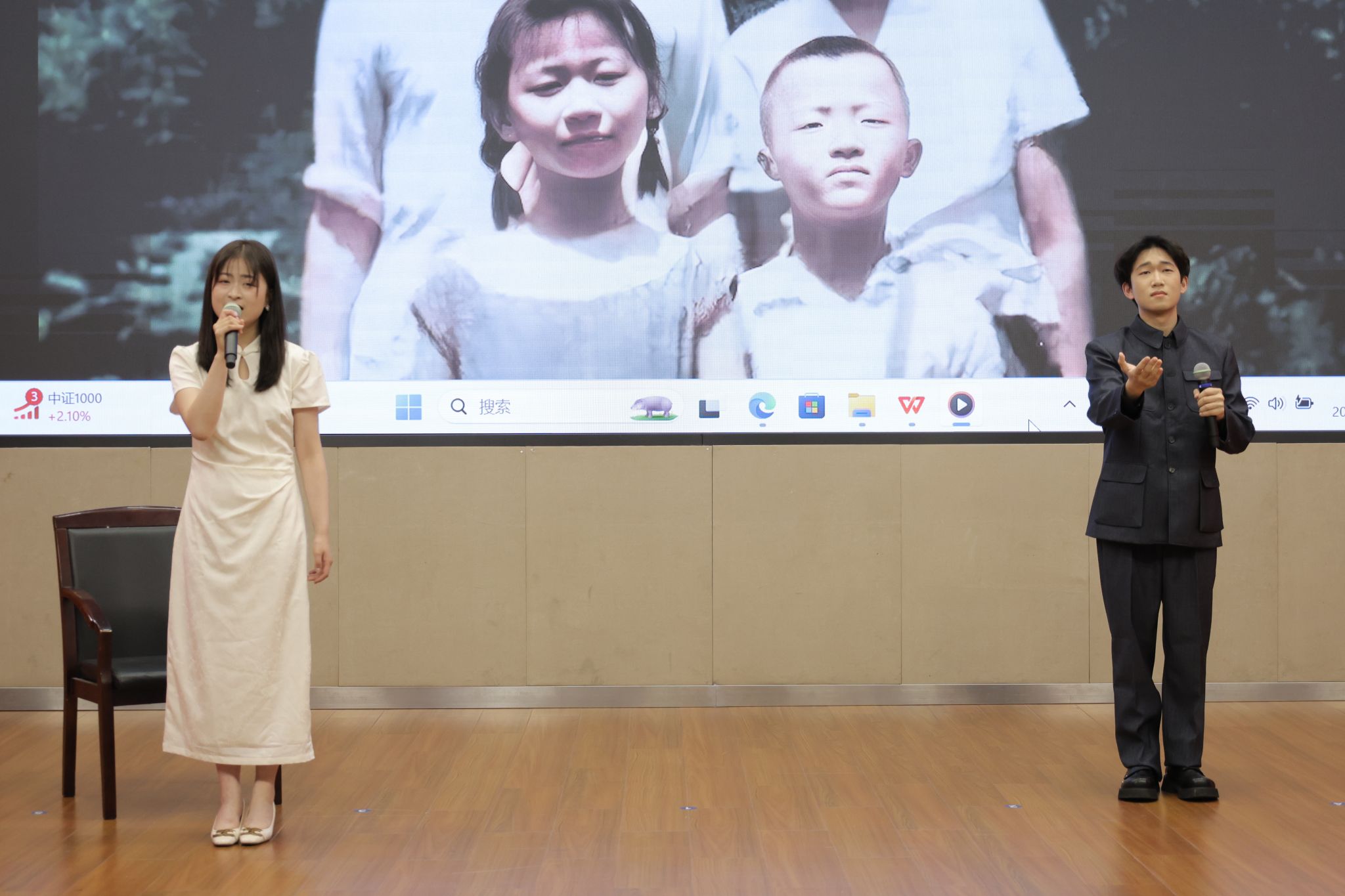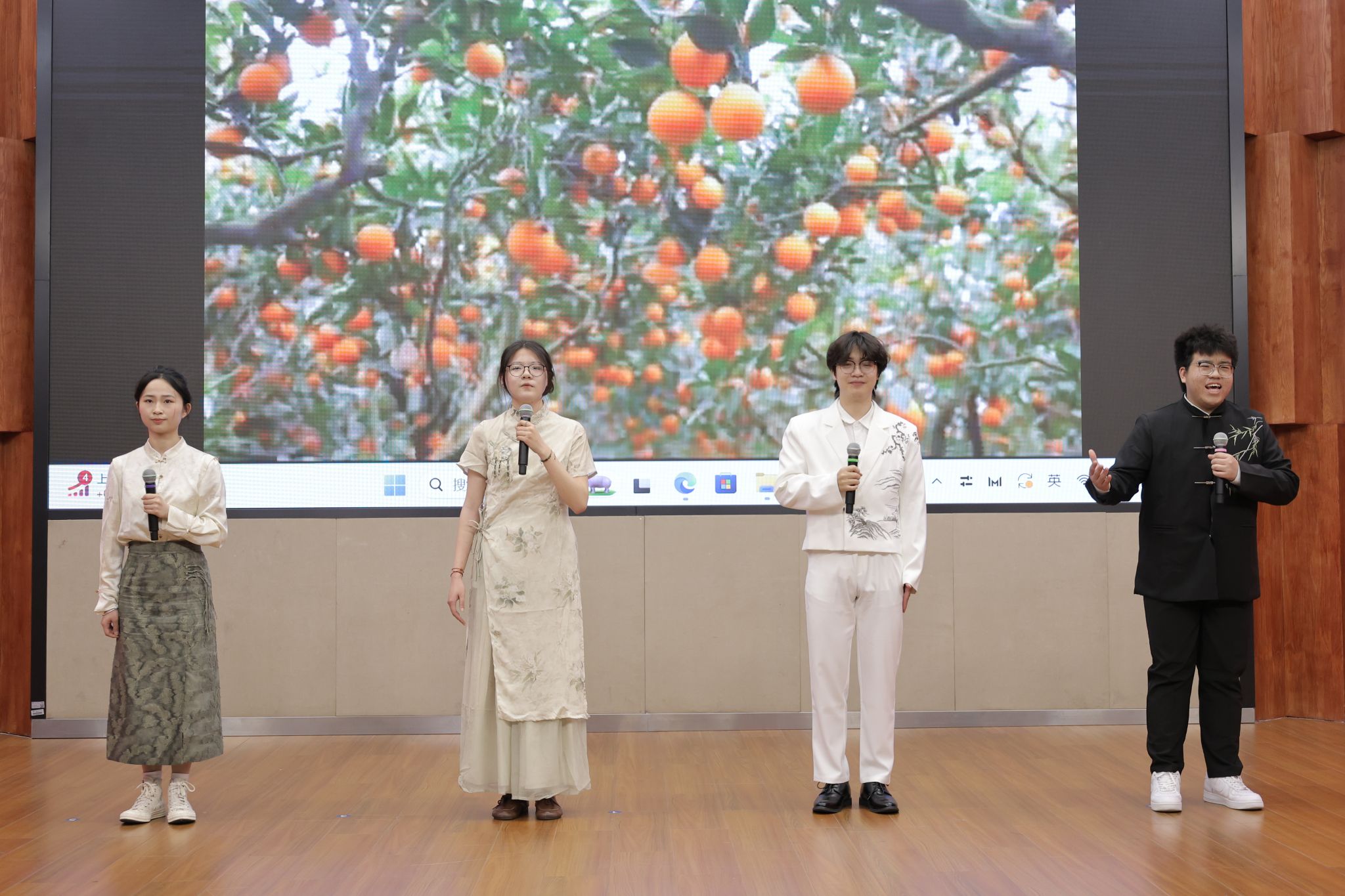 在经典诵读赛道上,参赛者们各展风采,凭借扎实的文学功底和精湛的朗诵技巧诠释经典。教育学院的潘奕瑶与钱炫合在作品《等待》中,深情诉说了邓稼先与许鹿希跨越二十八年的守望,这是个人情感的史诗,更是民族精神的缩影;吃瓜网 曹光豪、彭帅、丁熠冬、叶佳诚四人组的作品《月光下的中国》以诗性笔触织就山河入梦的磅礴画卷;唐佳楠、张雅诗、唐森浩、石嵩言四位同学则用《诗意中国》传递文化血脉中的浪漫情怀。他们或激情澎湃,或深沉婉转,起伏停顿间精准地把握着节奏韵律,赢得台下观众阵阵掌声。