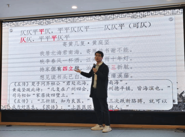 “《渡荆门送别》中的‘仍怜故乡水’这句,便是一处巧妙的拗救。原句应为平平仄仄平,李白却通过对‘故乡’二字平仄的颠倒,表达对故乡的思念。”他通过实际的案例,将深奥的格律知识变得通俗易懂,学员们豁然开朗。
