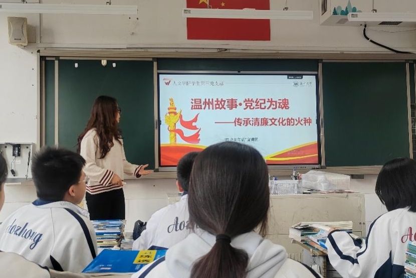 “1941年,16岁的她在被捕后受尽酷刑,却始终坚贞不屈……”随着大屏幕播放出郑明德故居的斑驳墙面,同学们仿佛回到了那个战火纷飞的年代。刘雪婷还结合温州浙南游击根据地的实际情况,用鲜活的语言讲述了党纪在革命战争年代的重要作用。宣讲结束后,同学们收获颇丰。课后问卷调查显示,超过72%的同学计划在节假日参观革命旧址,如浙南革命根据地纪念馆等,他们希望通过实地探访,深入了解革命历史,提高自己的政治修养和思想觉悟。这场宣讲,不仅是一座连接历史与现实的桥梁,更让我们看到:当“四史”学习与地方党史深度融合,五四精神与青年使命紧密相连,思政教育便能真正走进青少年内心,发挥铸魂育人的关键作用。