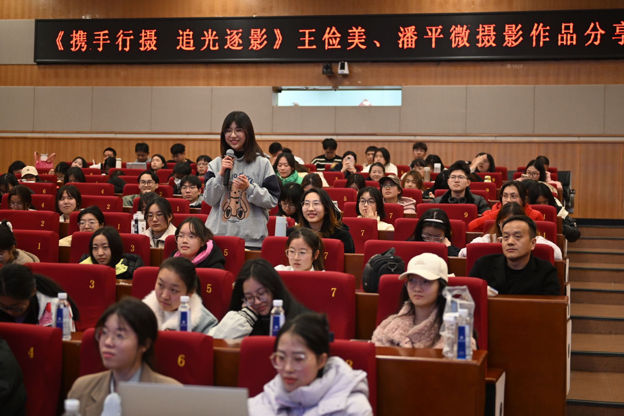 同学们带着对摄影的满腔热情,在交流互动环节踊跃发言,王俭美、潘平微夫妇耐心解答了同学们关于如何选择相机、如何后期完善摄影作品、如何克服在寻美之旅上的困难等各种问题,不遗余力地分享他们关于摄影的见解和经验。