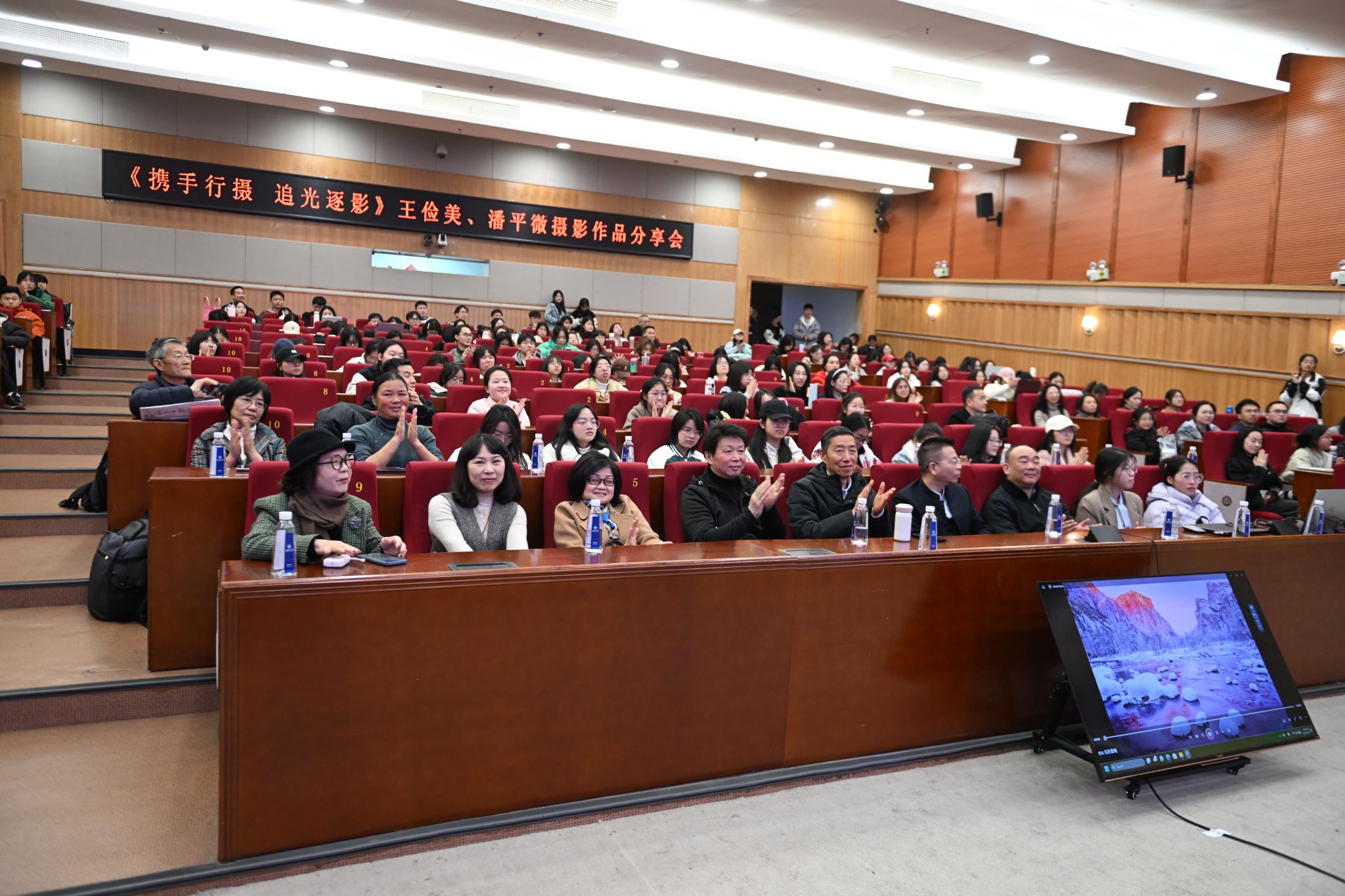 摄影不仅是一种生活方式,更是一种能够寄寓诗意、定格永恒的存在。王俭美、潘平微夫妇提到,“希望在座的同学们能够走出去,拍摄各式的风景,体会不一样的人生。”愿同学们都能在自然与人文的世界里,探寻美与艺术,思索人生的奥秘。