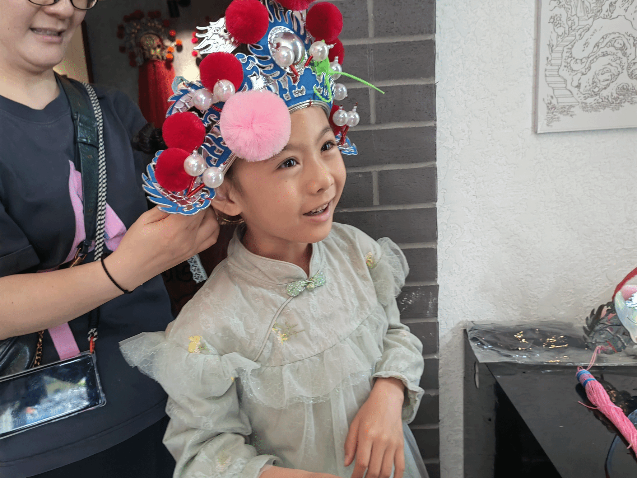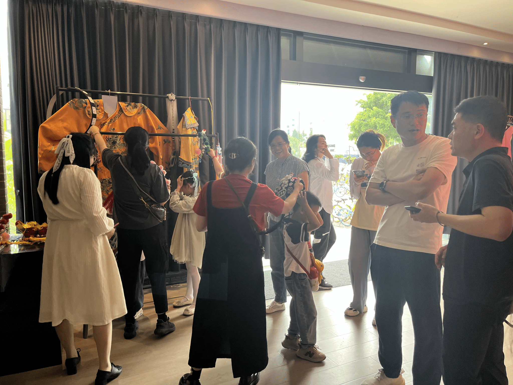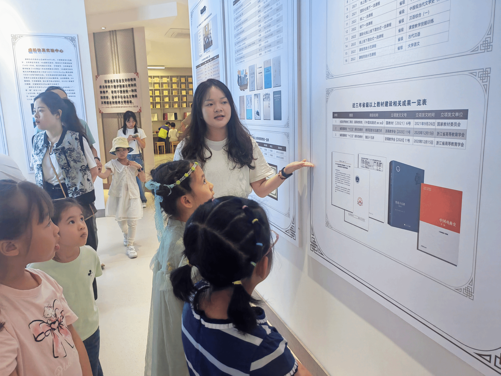 校友及孩子们相聚于浙江传统戏曲研究与传承中心,在讲解老师的引导下,深入了解了南戏的起源和发展历史。孩子们被中心内丰富的戏曲文物、珍贵的历史资料所吸引,不时发出赞叹之声。看到精美的戏曲服饰,孩子们纷纷按捺不住好奇的心,进行了体验穿戴。大家戴着做工精巧的头饰,切身感受着南戏艺术的魅力。在全息影像展示中,精彩的南戏角色表演吸引着孩子们全身心观看,沉浸于南戏的艺术魅力中。讲解老师的生动讲述和一件件展品勾勒出的南戏文脉,让大家深刻地感受到了南戏作为中国戏曲艺术瑰宝的独特魅力和深厚底蕴。