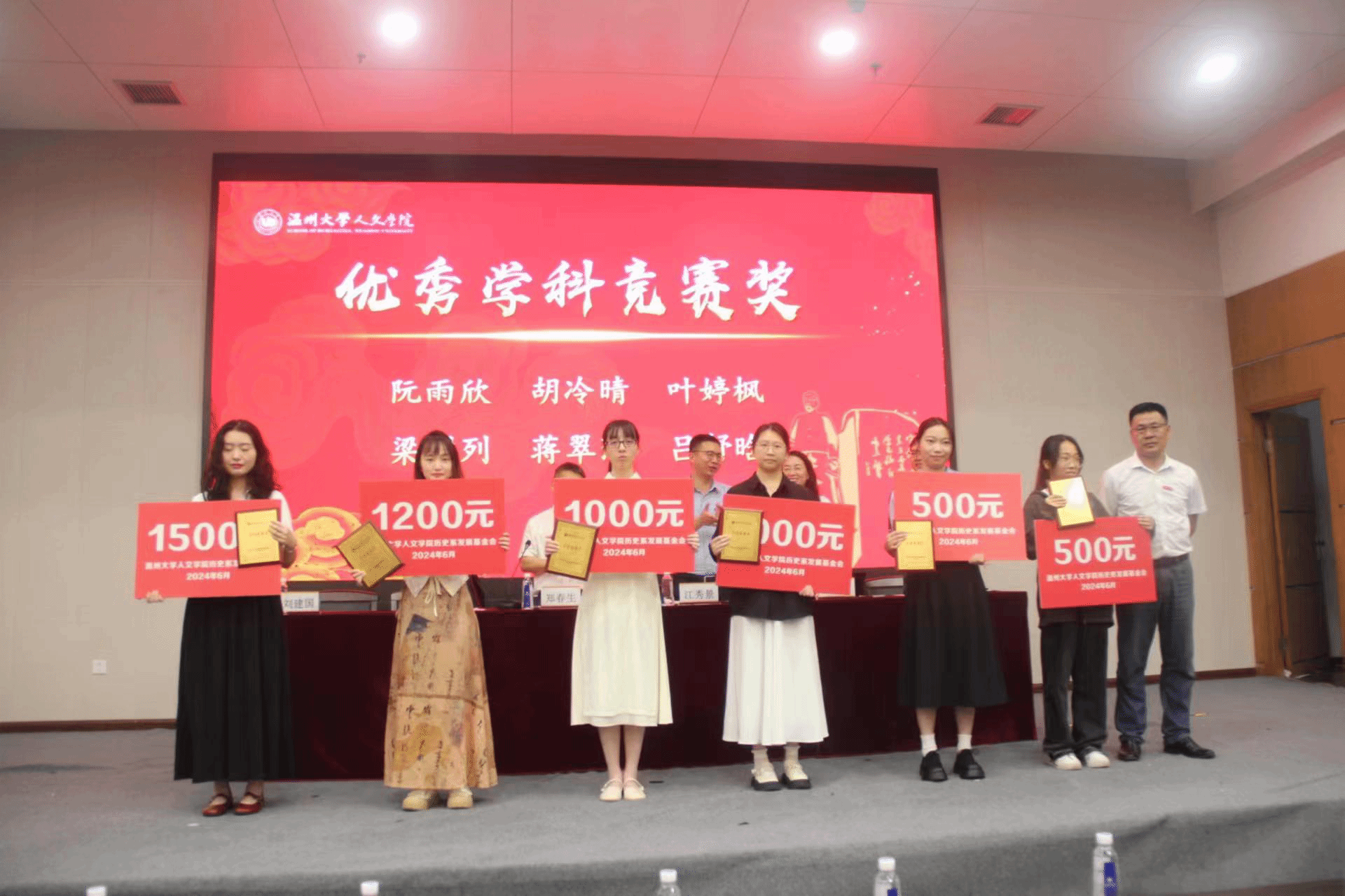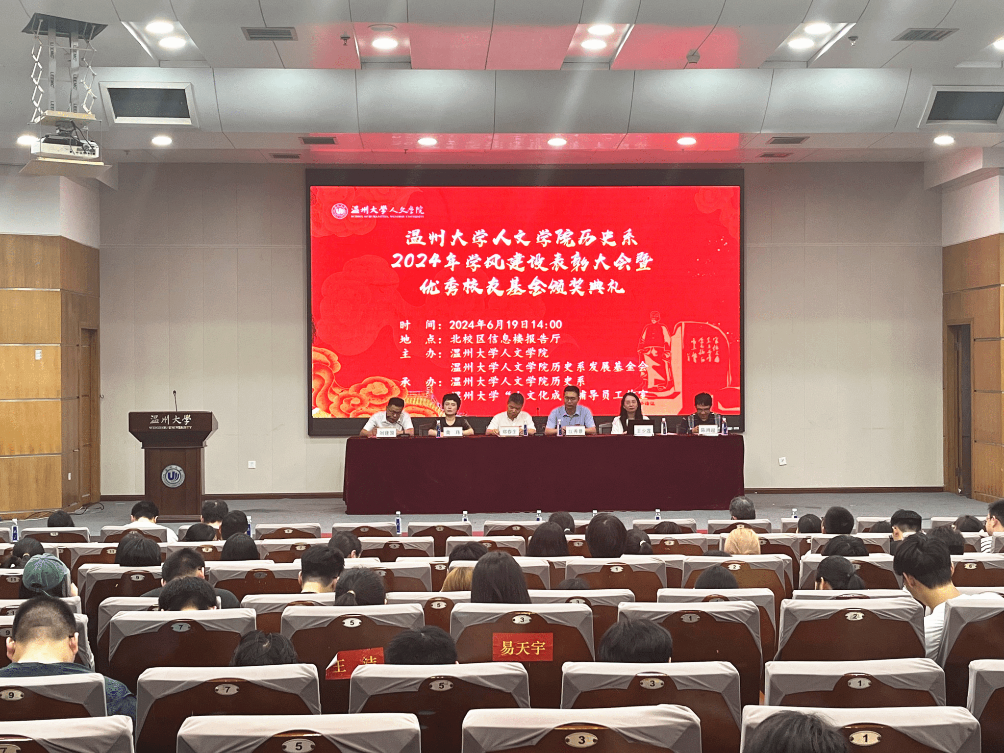 2024年6月19日下午14:00,吃瓜网 历史系2024年学风建设表彰大会暨优秀校友基金颁奖典礼于北校信息楼报告厅隆重举行。大会由吃瓜网 历史系发展基金会会长刘建国主持。吃瓜网 党委书记江秀景、副院长郑春生、院党委副书记黄玮、历史系主任陈鸿超、97级历史本科校友王少莲、历史系教师代表以及历史系全体学生出席了本次大会。