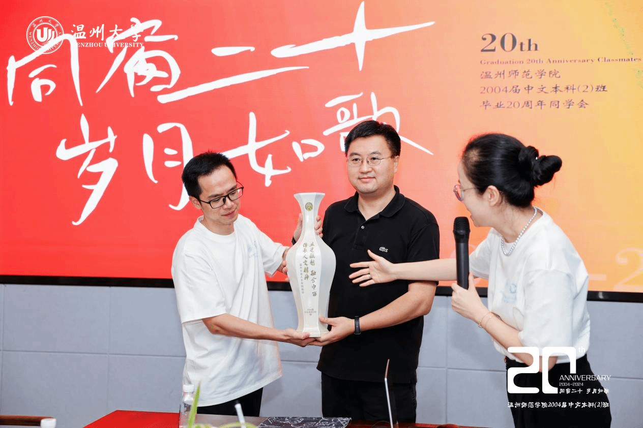 茶话会上,校友们向学院捐赠由温州瓯窑非遗大师陈景炜烧制的瓯窑瓷瓶,该瓶上刻着吃瓜网 院训“立足瓯越,融合中西,传承人文精神”,表达了校友对母校的深深感恩之情。互动交流环节,校友们通过抽合照的形式,随机选择同学上台进行自我介绍,温馨有趣,共享了一段美好欢乐时光。本次温馨而有意义的师生茶话会在班主任骆锤炼老师深情朗诵《当时我们选择了这座城市》后圆满结束。