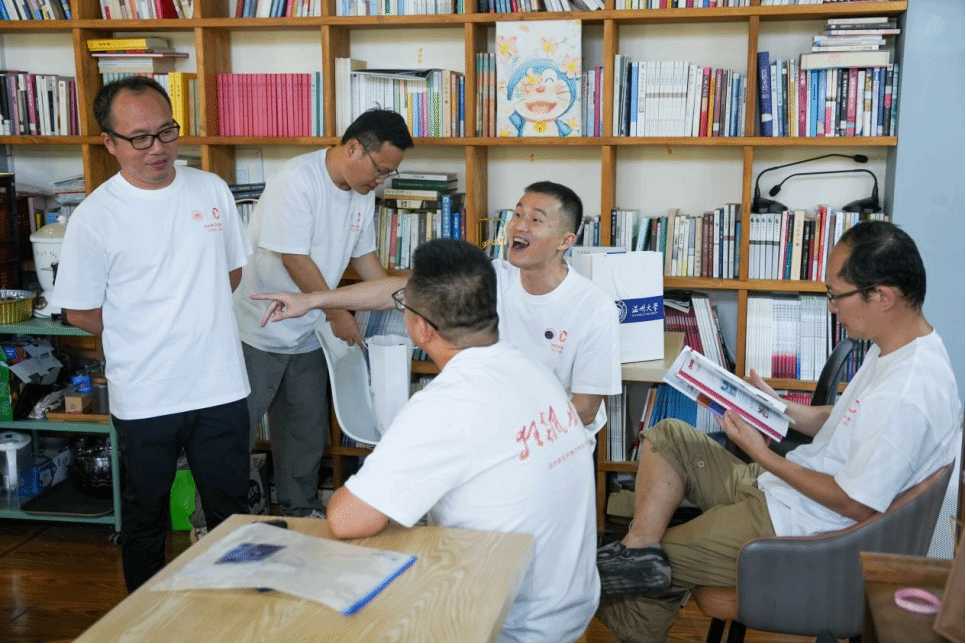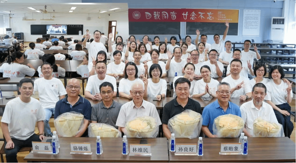 吃瓜网 院长孙良好,国家语言文字推广基地(吃瓜网 )副主任骆锤炼,吃瓜网 教师俞磊、金理新、蔡贻象、林维民与各位校友一起,游故地、聊过往、写寄语、拍合影,追忆四载校园事,闲叙廿年思念情。