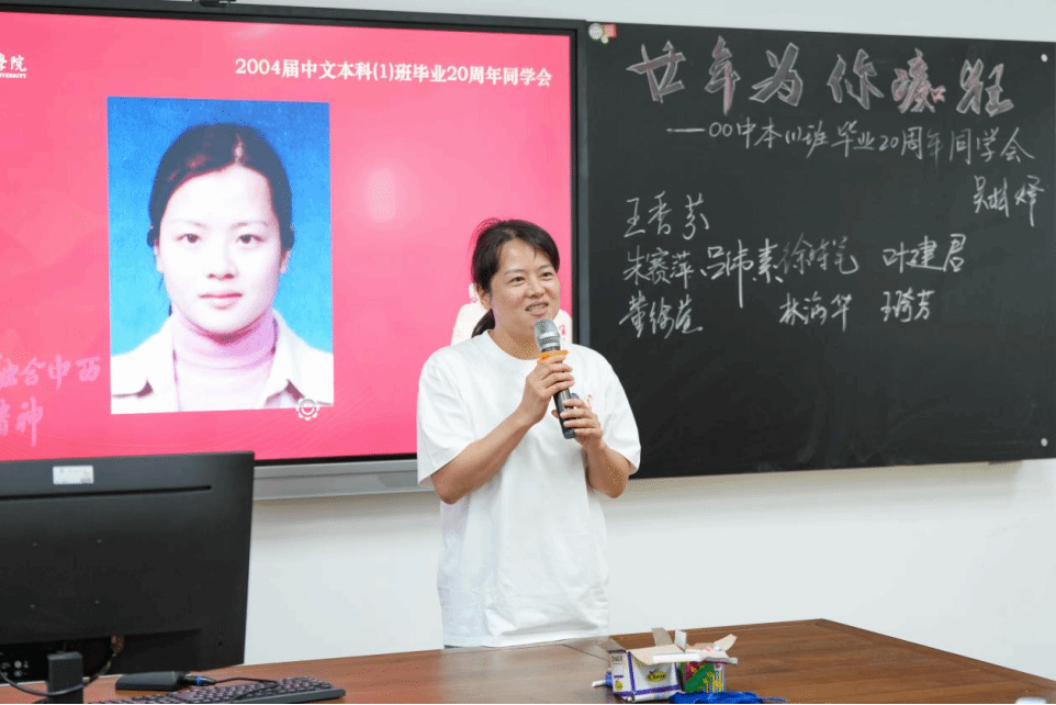 通过视频回溯了当年青春岁月之后,校友们按照曾经的学号依次上台,在20秒的时间内,向老师汇报自己的语文素养基本功,在黑板上一笔一划地写下自己的姓名,一句话介绍自己毕业后的工作经历,大家完美展现了自己扎实的师范技能及课堂把握的能力,老师们纷纷点头微笑以表赞许。