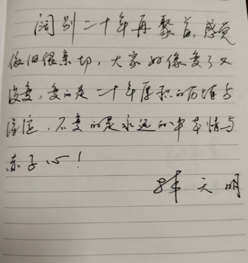 期间,校友们各自与20年前的学生照合影留念。这一刻,仿佛时光倒流,大家又回到了那段肆意飞扬的年少时光,分享着自己的感慨与愿景:“时光荏苒,我们的同学情谊永远不变!”“感谢师恩,希望能常回母校看看!”