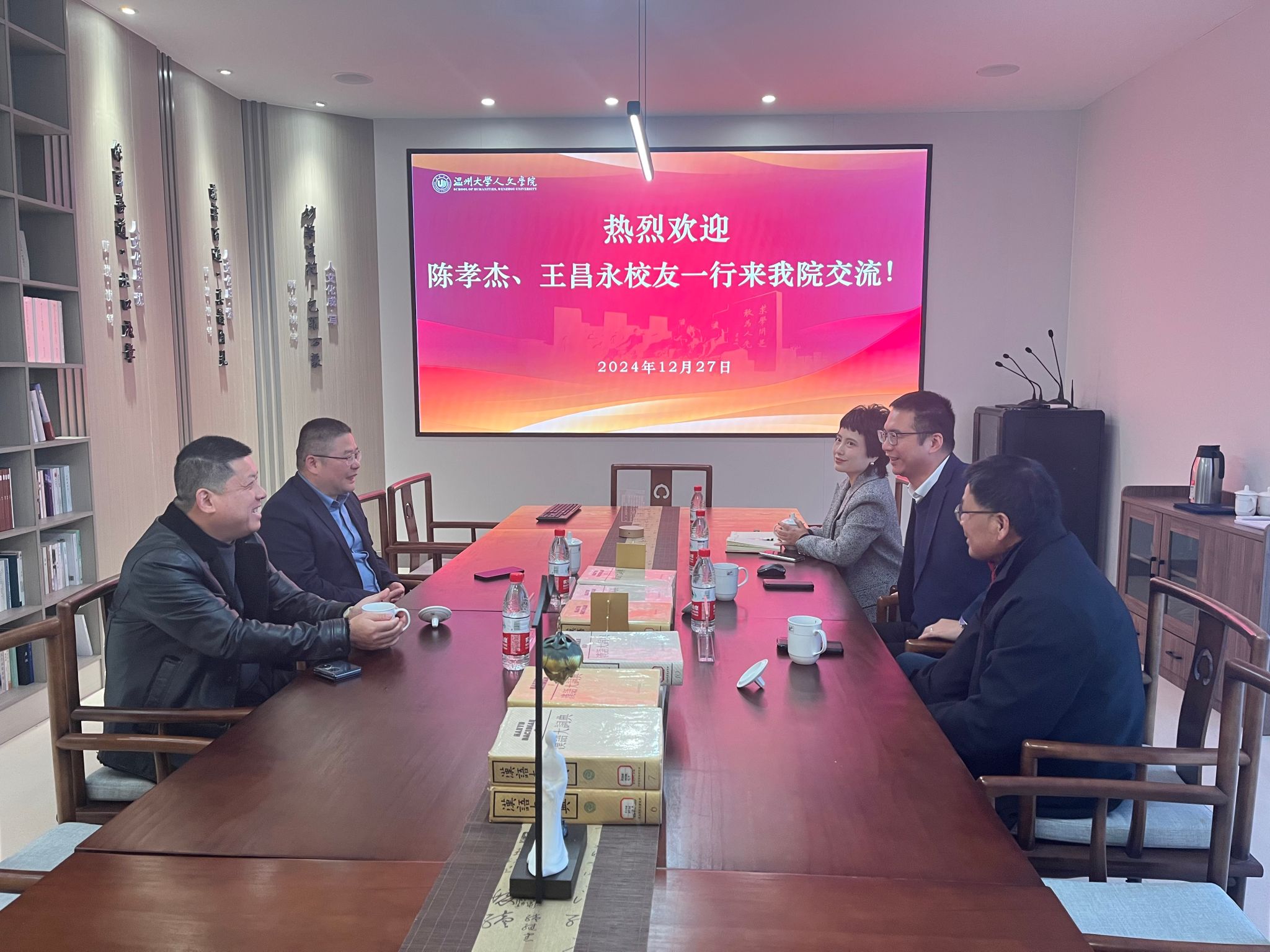 为了加强与校友的沟通交流,谋求教育领域的合作发展,2024年12月27日下午,温州万全教育集团董事长陈孝杰校友与副总裁王昌永校友来访吃瓜网 ,院党委书记江秀景、院党委副书记黄玮与温州历史文化研究中心负责人刘建国陪同。